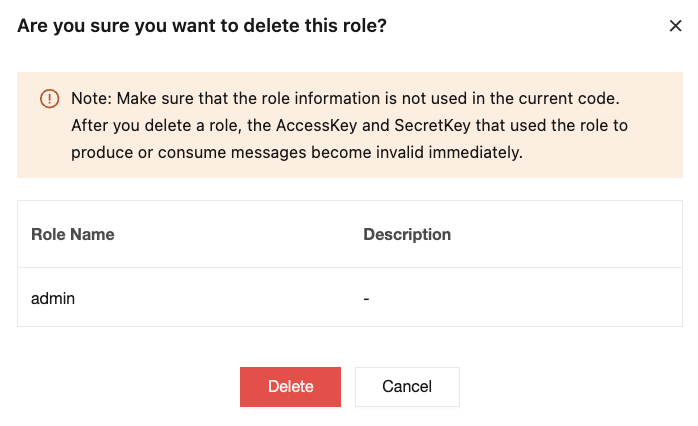 After a role is deleted, the token (AccessKey and SecretKey) previously used by the role for message production or consumption becomes invalid immediately. Ensure that the role is no longer used for message production or consumption in business operations; otherwise, exceptions may occur because the client cannot produce or consume messages.