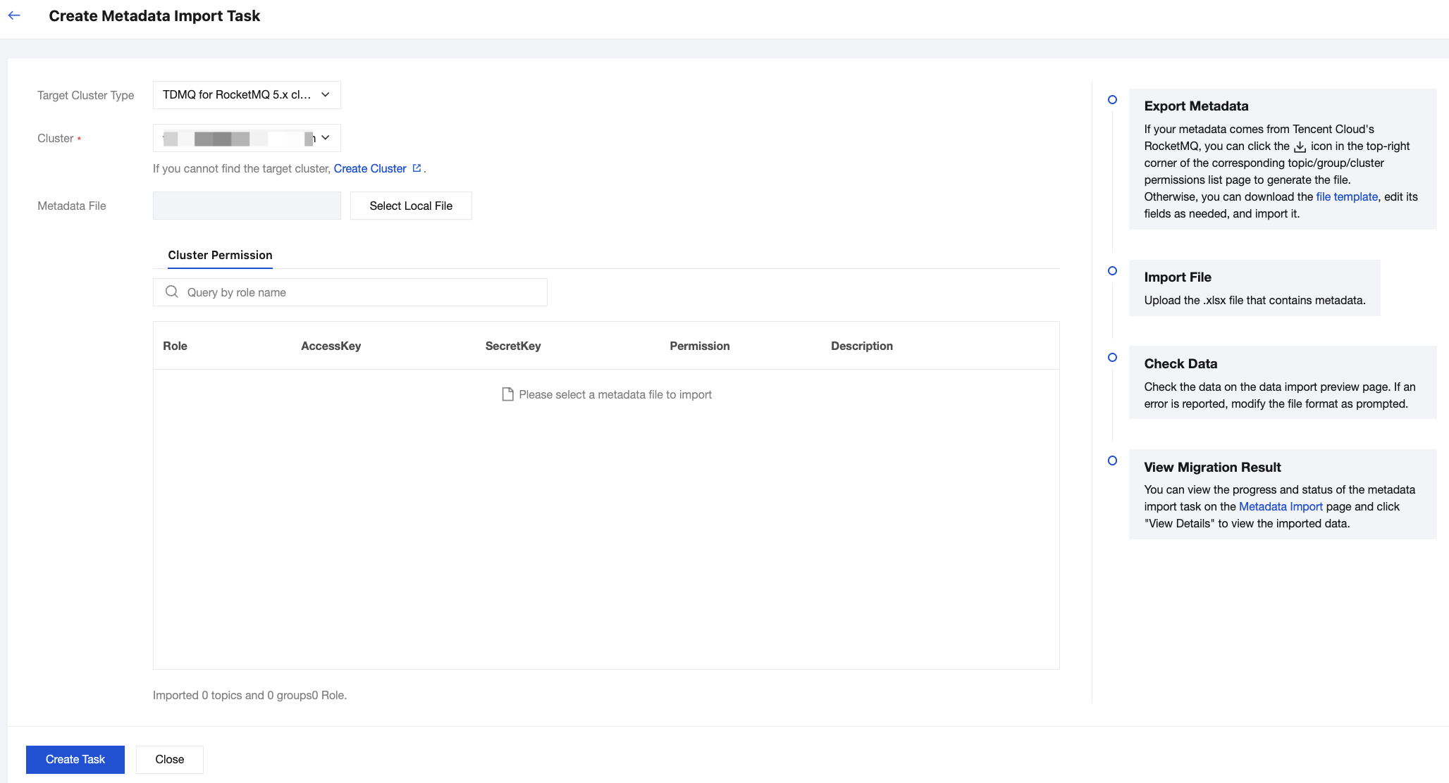You can click the icon in the upper-right corner of the Role List page to export metadata to an .xlsx file. If you need to import roles and permissions from one cluster to another, you can click the icon in the upper-right corner of the Role List page to import the permission data into the target cluster after you export metadata. If your data is not from TDMQ for RocketMQ of Tencent Cloud, click the file template link, locate the corresponding template, edit relevant fields, and import the file.