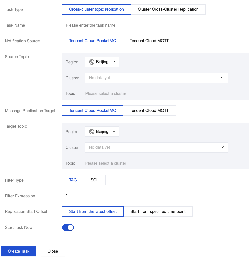 Log in to the TDMQ for RocketMQ console, click Cross-Cluster Replication > Create Task in the left sidebar, and specify the following fields as required: Task Name: It must be up to 200 characters in length and can contain only Chinese characters, digits, letters, hyphens (-), and underscores (_).