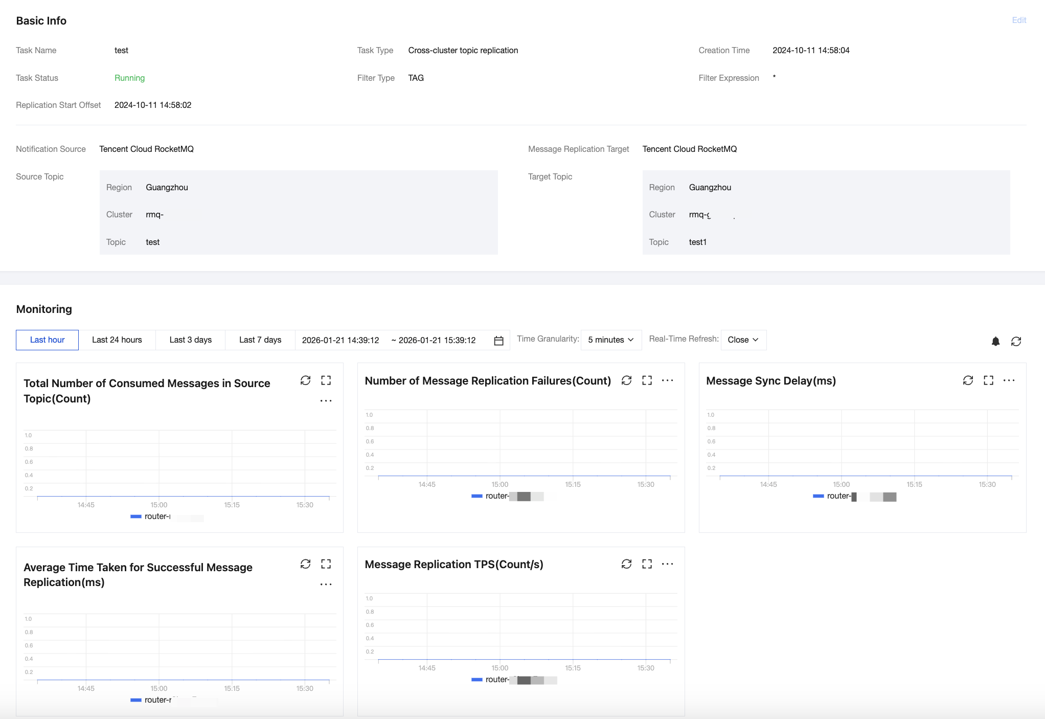 You can click the task name to go to the task details page and view detailed configurations, such as filtering rules and start time. In the Monitoring section, you can view real-time monitoring data of the message replication task, including the total number of source messages consumed, the number of messages that failed to be replicated, and the message replication delay.