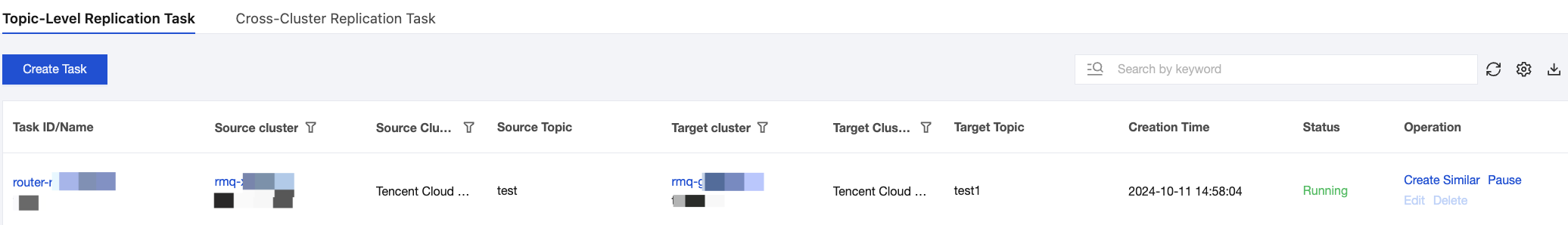 Log in to the TDMQ for RocketMQ console, click Cross-Cluster Replication in the left sidebar, select a created task, and click Create Similar in the operation column. The parameters same as those of the replication task are automatically specified on the task creation page. You only need to make simple modifications to create a task. (The console does not allow creating tasks with the same configurations.) Viewing Task Details