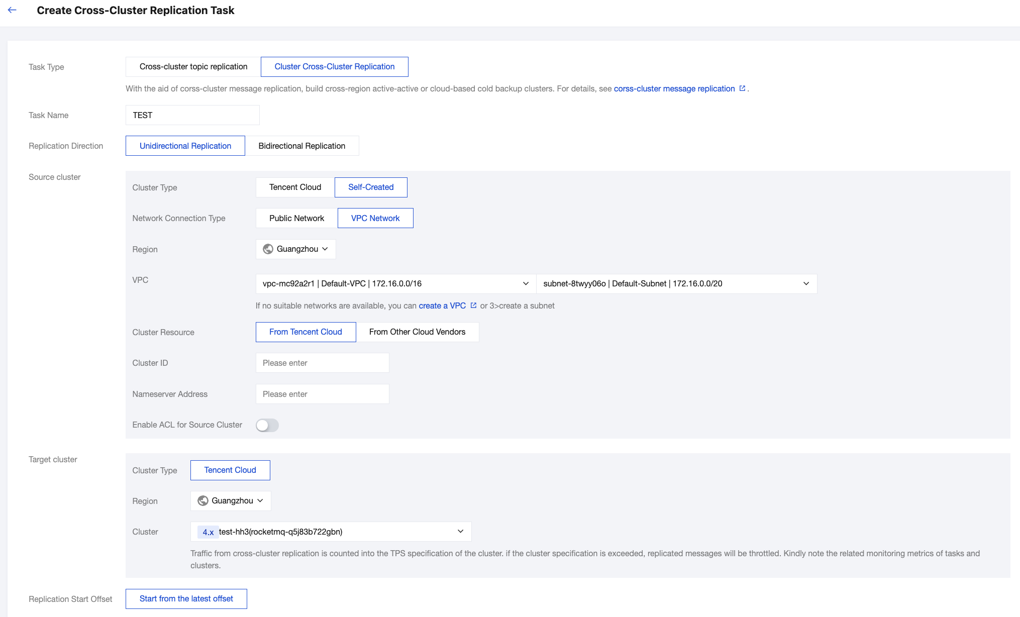 Target cluster: The filling rules are the same as those for the "source cluster". For inter-cluster replication tasks, at least one of the source cluster and target cluster must be Tencent Cloud TDMQ for RocketMQ.