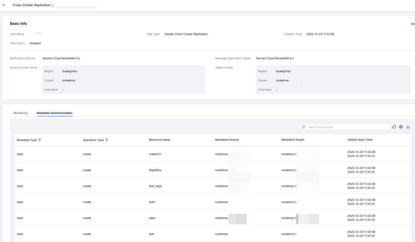 Delete: Delete the current task. After deletion, the replication task will be suspended, and the relevant configurations will be removed. Please exercise caution. Once the task is deleted, modifications to metadata (such as Topics, Groups, and roles) made in the source cluster will no longer be replicated to the target cluster.
