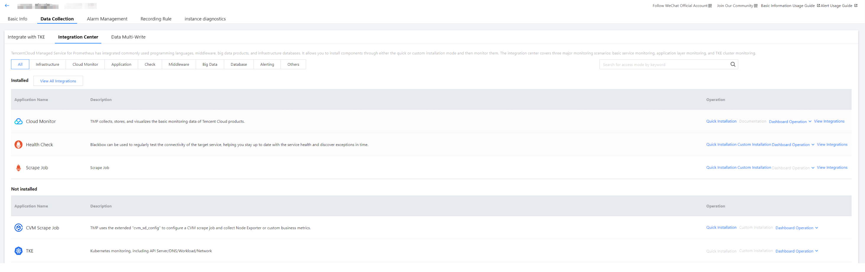 To facilitate access, TMP integrates commonly used development languages, middleware, and big data. You only need to follow the instructions to monitor the corresponding components. It also provides out-of-the-box Grafana monitoring dashboards.
