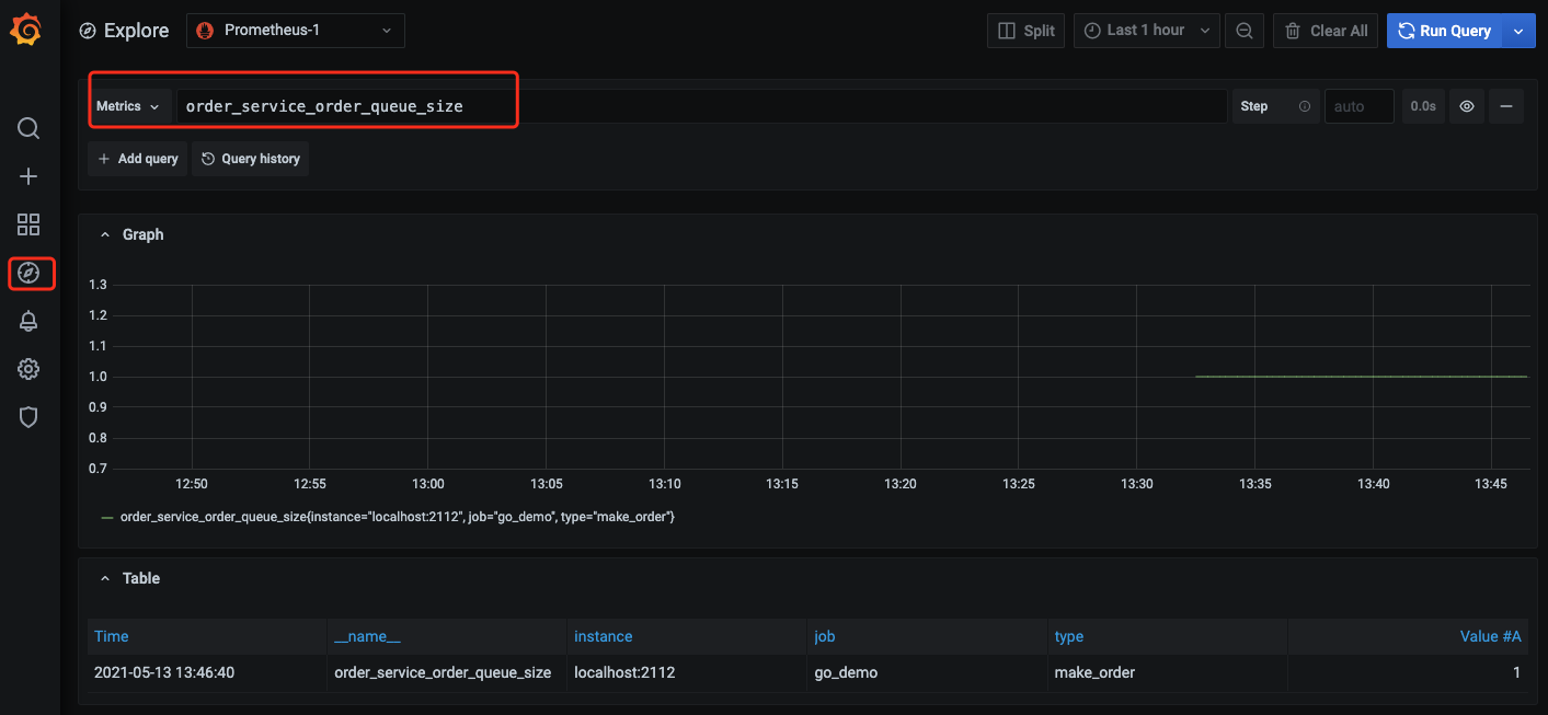 Gauge 来监控订单队列大小:package orderimport ("github.com/prometheus/client_golang/prometheus""github.com/prometheus/client_golang/prometheus/promauto")// 定义需要监控 Gauge 类型对象var (queueSize = promauto.NewGaugeVec(prometheus.GaugeOpts{Name: "order_service_order_queue_size",Help: "The size of order queue",}, []string{"type"}))type OrderQueue struct {queue chan string}func newOrderQueue() *OrderQueue {return &OrderQueue{queue: make(chan string,100),}}// 产生订单消息func (q *OrderQueue)produceOrder() {// 产生订单消息// 队列个数加1queueSize.WithLabelValues("make_order").Inc() // 下单队列// queueSize.WithLabelValues("cancel_order").Inc() // 取消订单队列}// 消费订单消息func (q *OrderQueue)consumeOrder() {// 消费订单消息// 队列个数减1queueSize.WithLabelValues("make_order").Dec()}