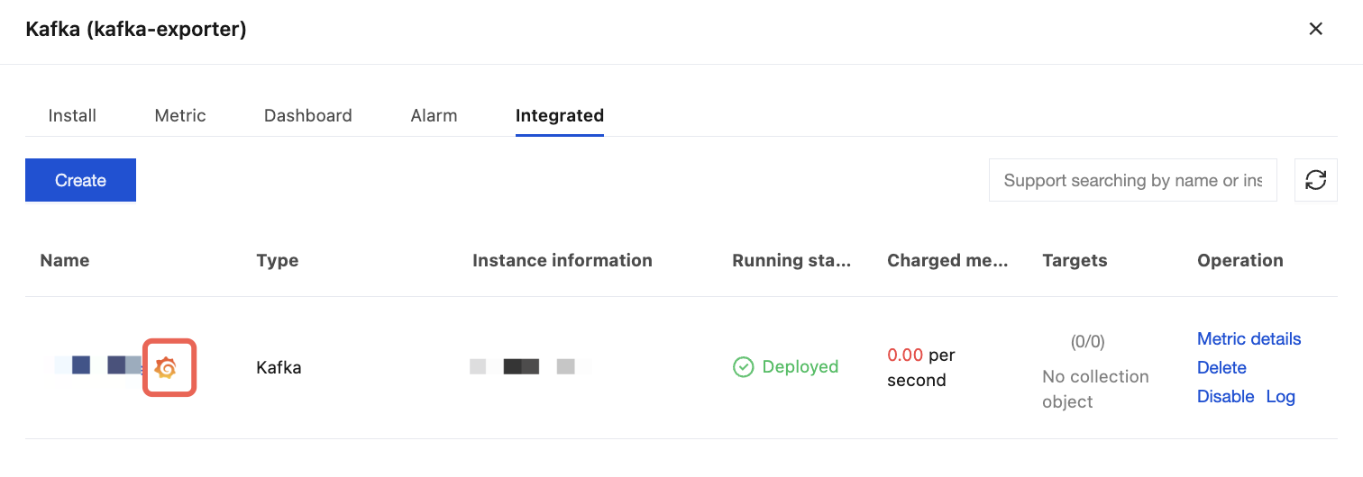 3. Select Integrated. In the integrated list, click the Grafana icon to automatically open the Kafka Monitoring Dashboard and view the monitoring data related to the instance, as shown below: