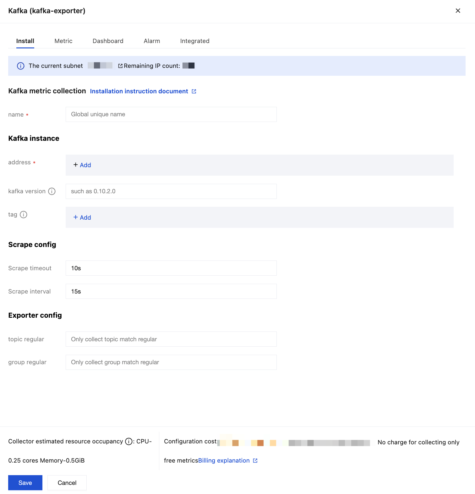 4. In the Integration Center, locate and click Kafka to open an installation window. On the installation page, enter details such as the metric collection name and address, then click save.