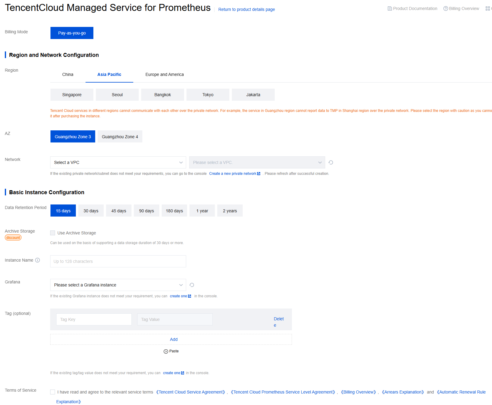 2. On the purchase page, select the target instance specification and network. Make sure that the TMP and CVM instances have the same VPC IP range so that data can be collected. Select the instance specification based on your reported data volume.
