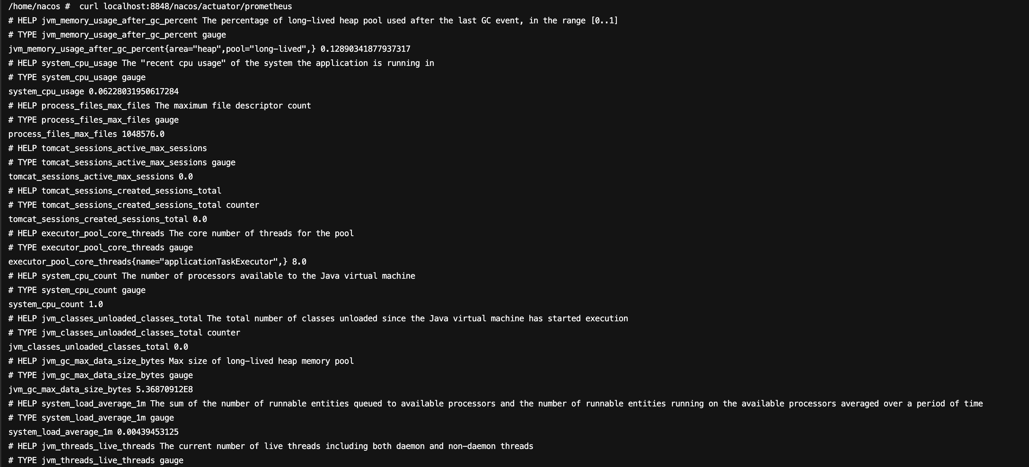 kind: StatefulSetapiVersion: apps/v1metadata:name: nacosnamespace: publicspec:replicas: 3selector:matchLabels:app: nacostemplate:metadata:labels:app: nacosspec:containers:- name: nacosimage: nacos/nacos-server:latestenv:#...# 增加这个环境变量- name: management.endpoints.web.exposure.includevalue: 'prometheus'#...