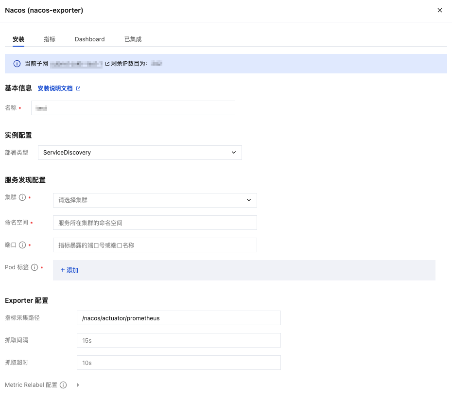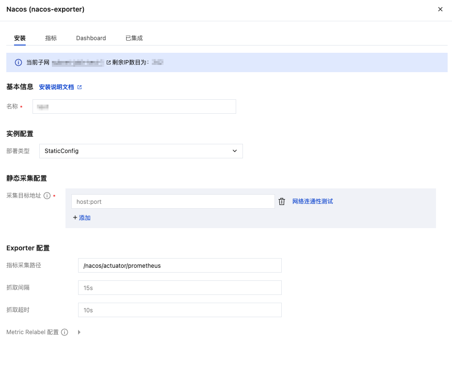 指标采集路径 | Nacos 指标暴露的路径,默认为 /nacos/actuator/prometheus。 |