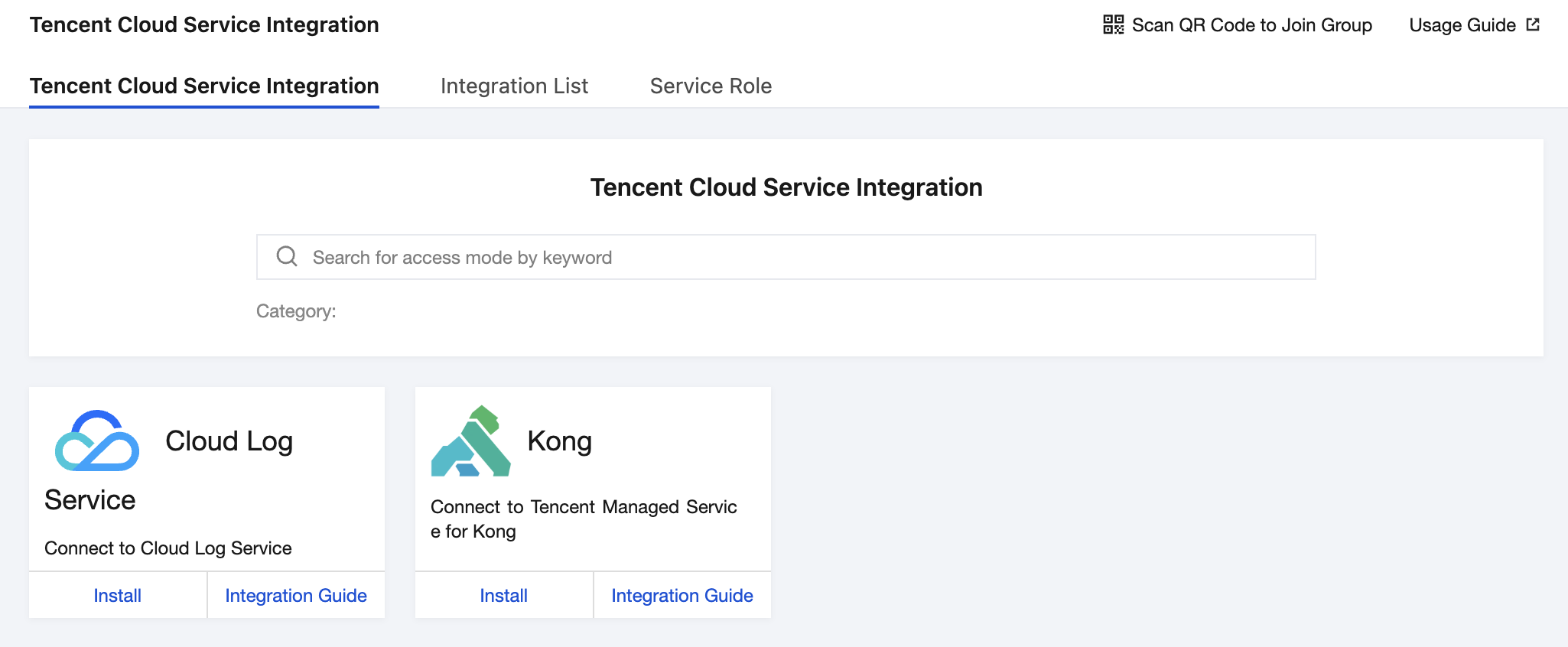 Select Integration List to view the installed integrations, which may be installed by you or automatically by Tencent Cloud services through the binding relationship and can be deleted in the Operation column.