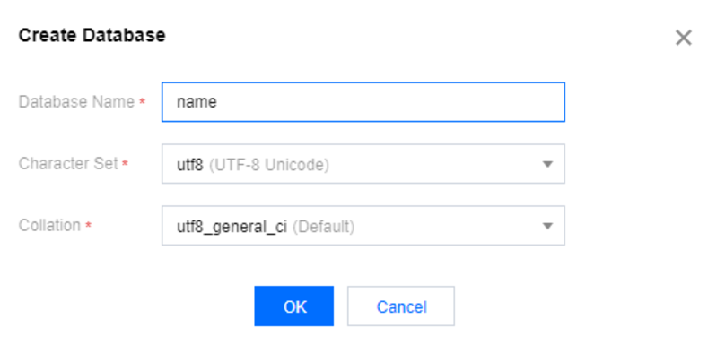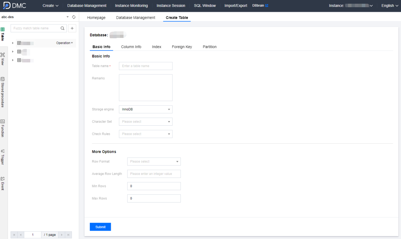 2. In the pop-up dialog box, configure the new database or table and click OK or Submit.