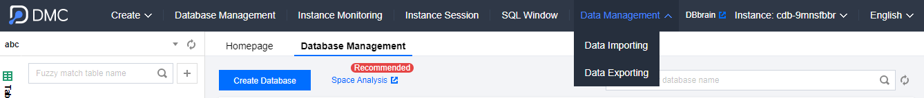 Log in to the DMC console, select Data Management > Data Importing or Data Exporting on the navigation bar at the top, and you can import data into or export data from a database.