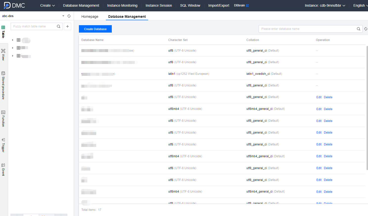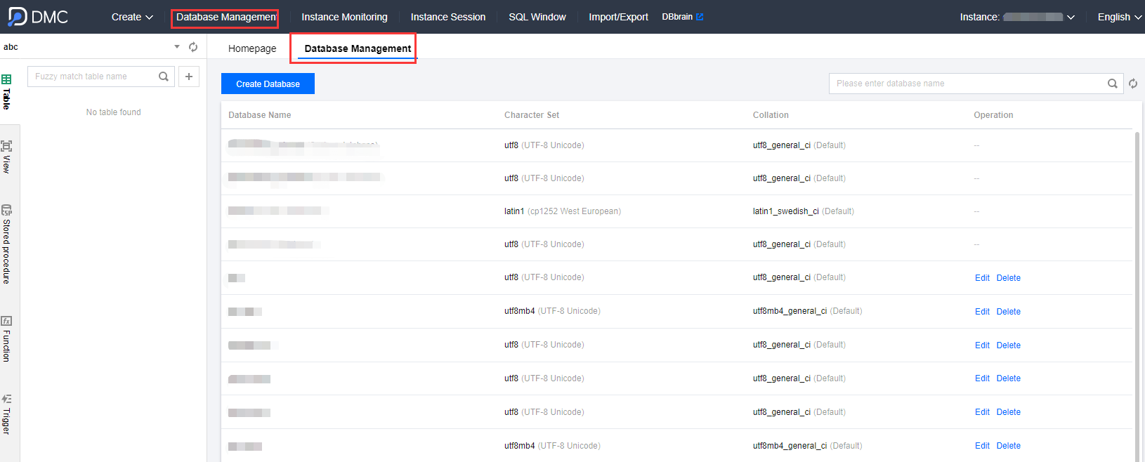 Log in to the DMC console, select Database Management on the navigation bar at the top, and create, edit, or delete databases on the displayed page.