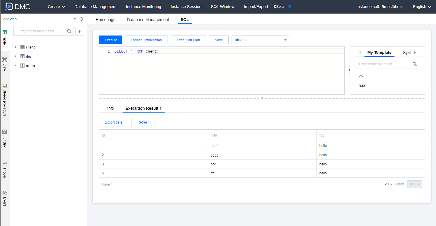 Log in to the DMC console, select SQL Window on the navigation bar at the top, or click SQL Operation on the Operation menu on the left sidebar to access the SQL window, which supports the following features: Run SQL commands and view results