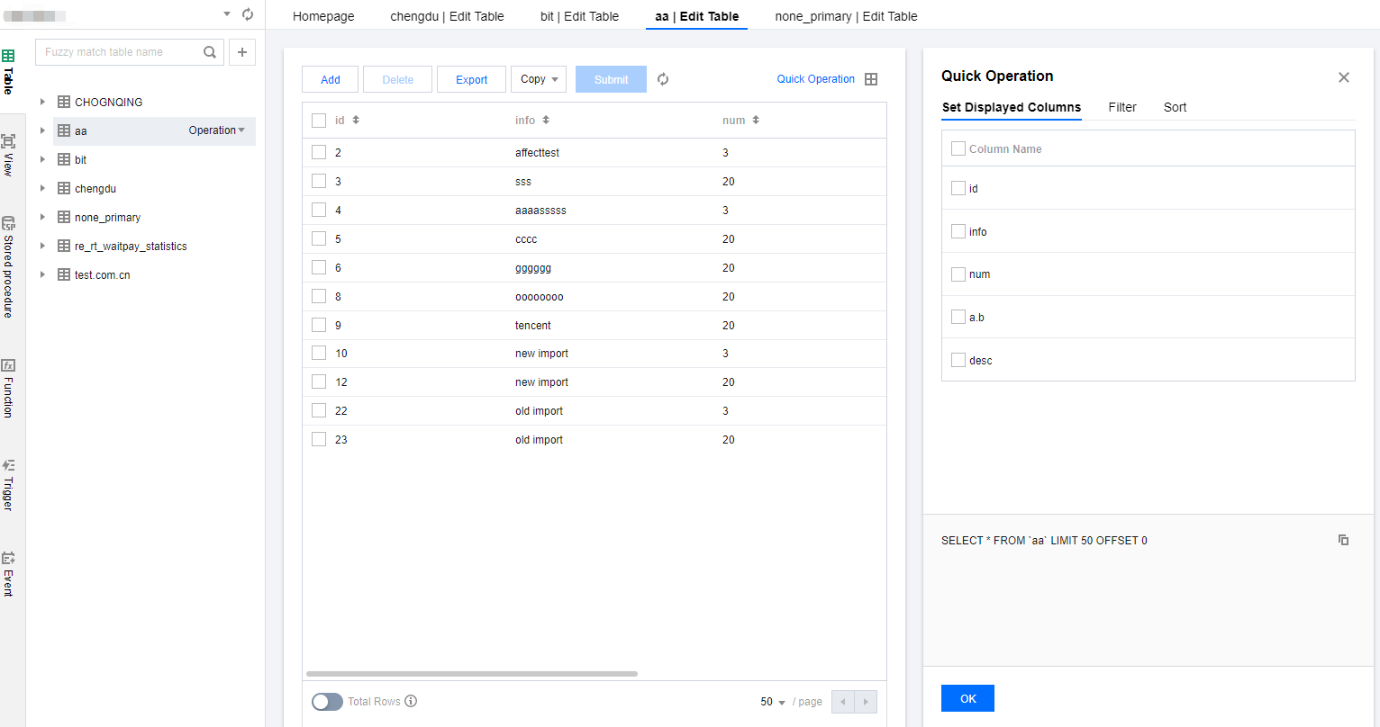 DMC for MySQL supports inserting, deleting, and updating data. You can click a table in the left Table list to insert, delete, and update its data in batches in the right pane, and then click OK in the Quick Operation pane to preview the SQL statements and implement the modification.