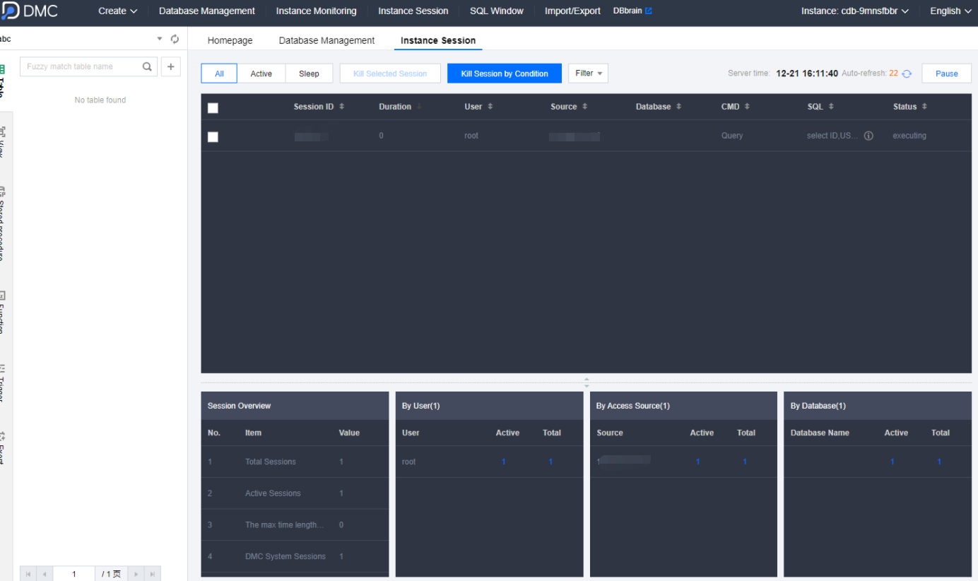 Log in to DMC, select Instance Session on the navigation bar at the top, and enter the instance session management page. You can view the details of all database sessions in the instance from four dimensions: session overview, users, access sources, and databases.