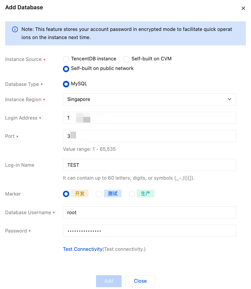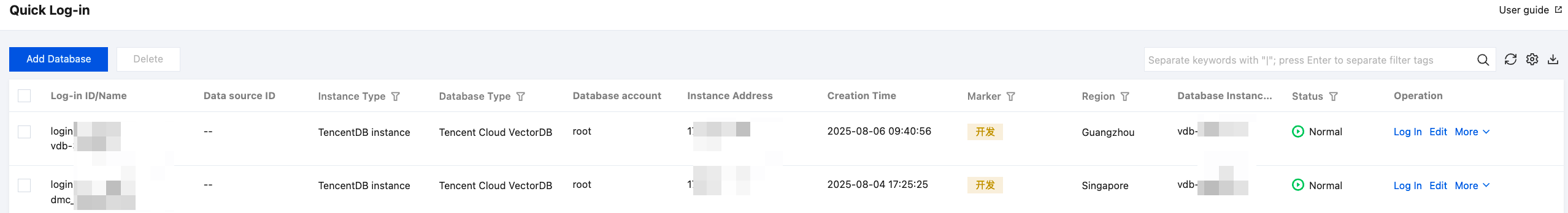 Operation | One-click login and enter the SQL window: Click Log in. For detailed instructions, see Log in to Instance. Modify the username and password for database access: Click Edit. For detailed instructions, see Modify the Username and Password for Database Access Instance. View account permissions: Click More > View Permissions. Modify instance tag: Click More > Modify Markers, then click OK after making the changes. Delete quick login: Click More > Delete, and then click Delete. Note: Instances that have been added to the data source do not support editing or modifying tags on the quick login page. To perform these operations, go to the Data Source page for modifications. |
