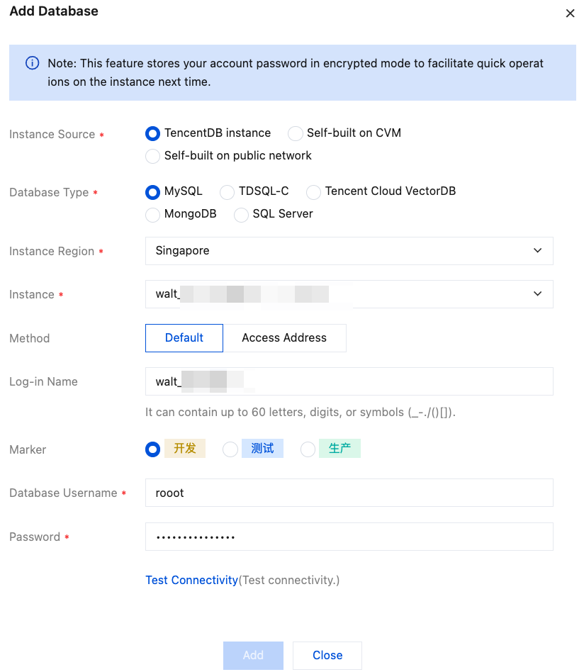 Method | No | Access method, including default and access address. Default: Represents the read-write address of the primary instance. Access address: Select the instance access address, including the primary instance address, read-only instance address, read-only node address, read-only group address, and database proxy address. This applies only to the MySQL database type. | ✓ | × | × |