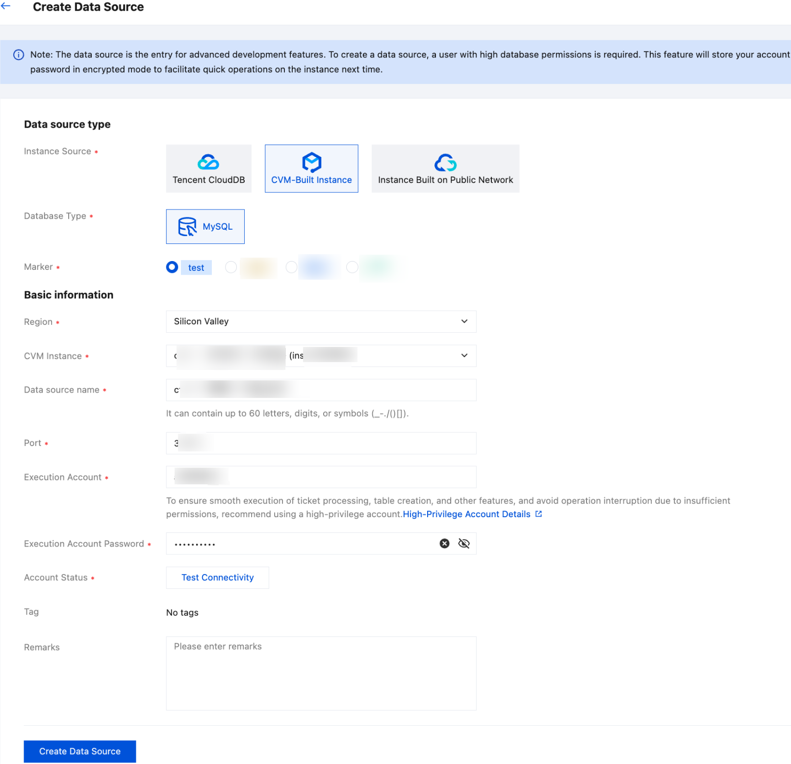| Data Source Name | It is customizable and uniquely identifies a data source. Naming specification: Only numbers, uppercase and lowercase English letters, Chinese characters, and special characters such as _, -, ., /, (), and [] are supported, with a length less than 60. Example value: test | ✓ | ✓ | ✓ |