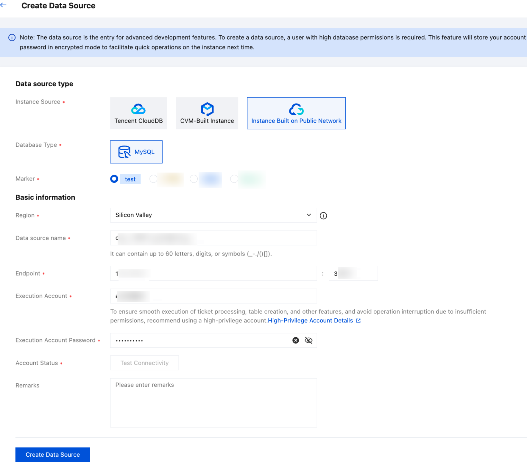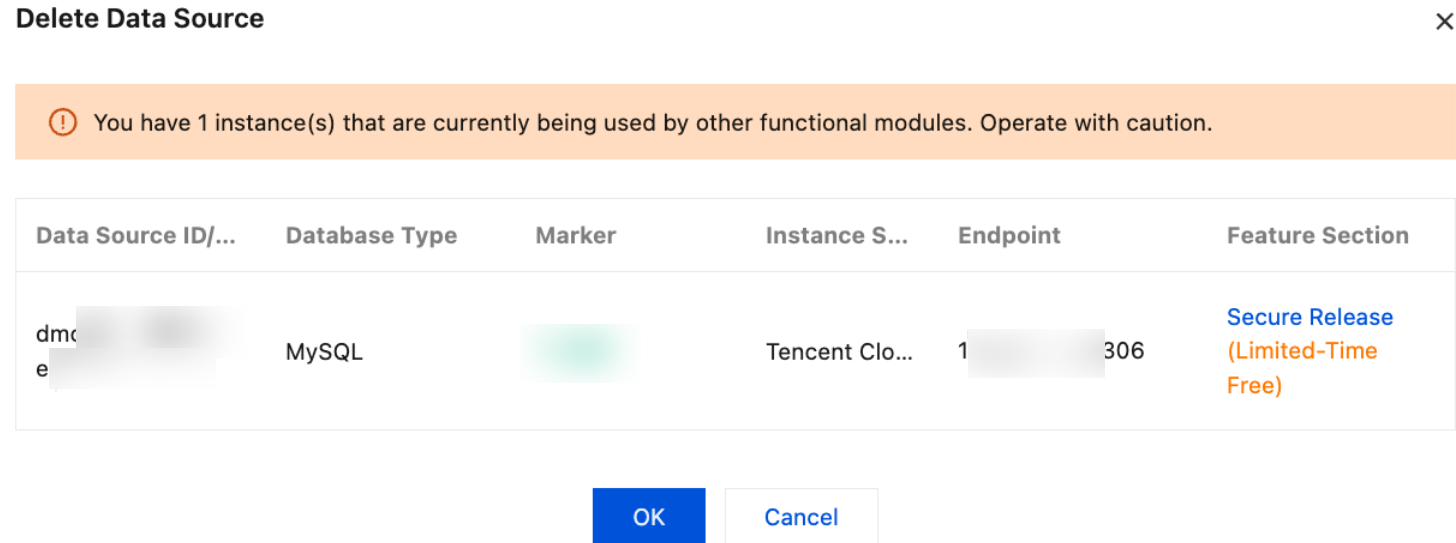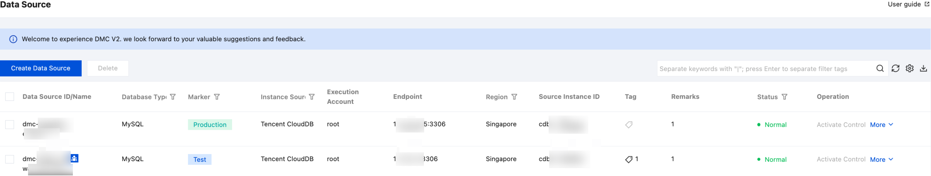 Operation | Enable control for the source instance: Click Activate Control. For detailed operations, see Control is enabled for the data source. Modify the Execute Account of the Source Instance: Click More > Modify Execute Account. For detailed operations, see Modifying the Execution Account of the Data Source. Modify the tag of the data source: Click More > Modify Markers. After modifying the tag, click OK. Delete the data source: Click More > Delete. For detailed operations, see Deleting the Data Source. |