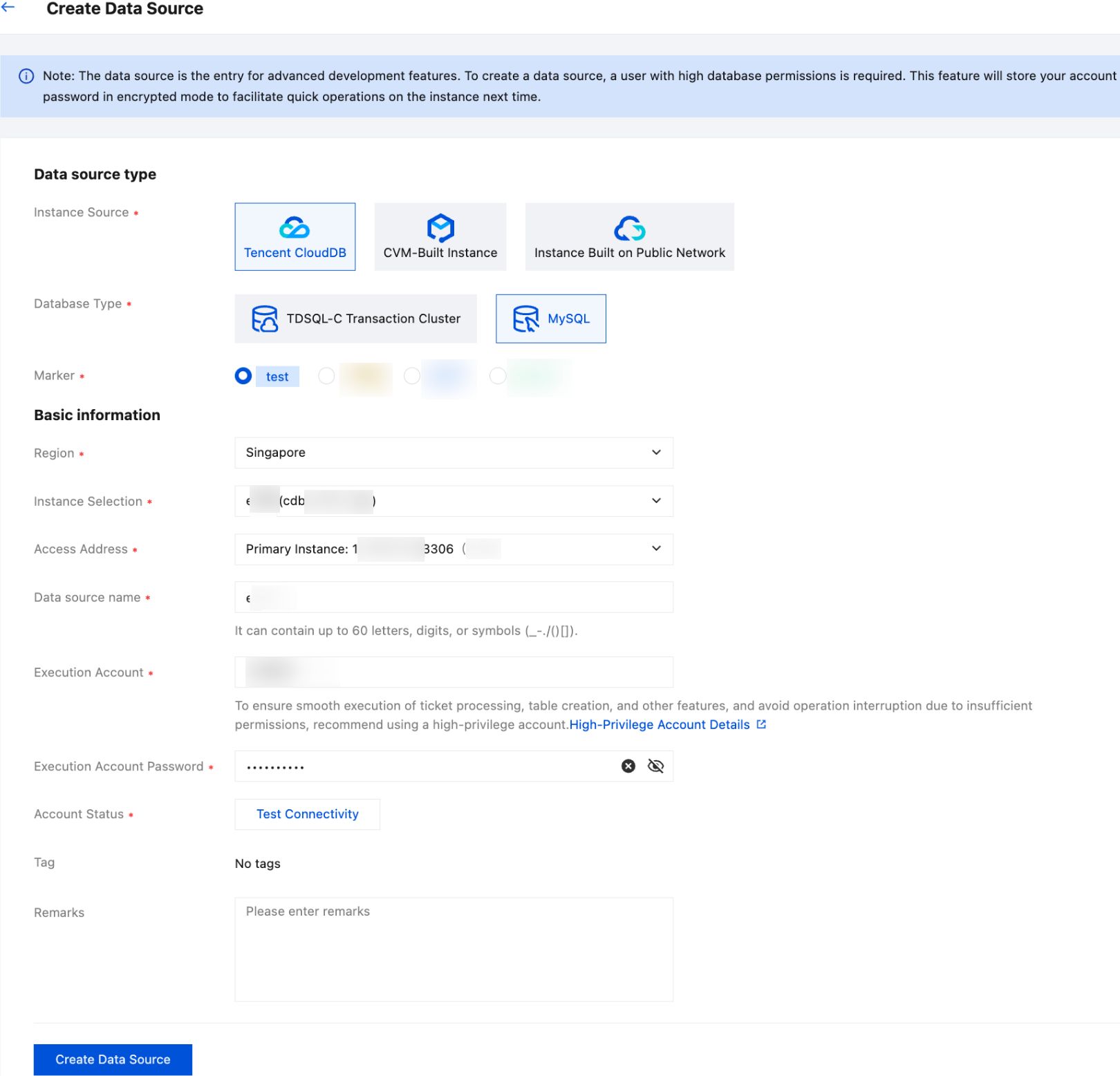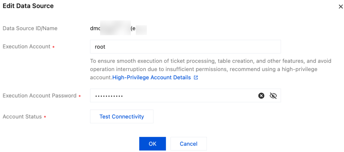 | Execution Account | Enter the high-level permission account of the database instance for the execution of advanced database features. If a low-level permission account is used, the system will prompt a detection failure when checking account permissions and connection status. For information on how to set high-level permissions for an account, see Setting High Privileges for Database Instance Accounts. Example value: root | ✓ | ✓ | ✓ |