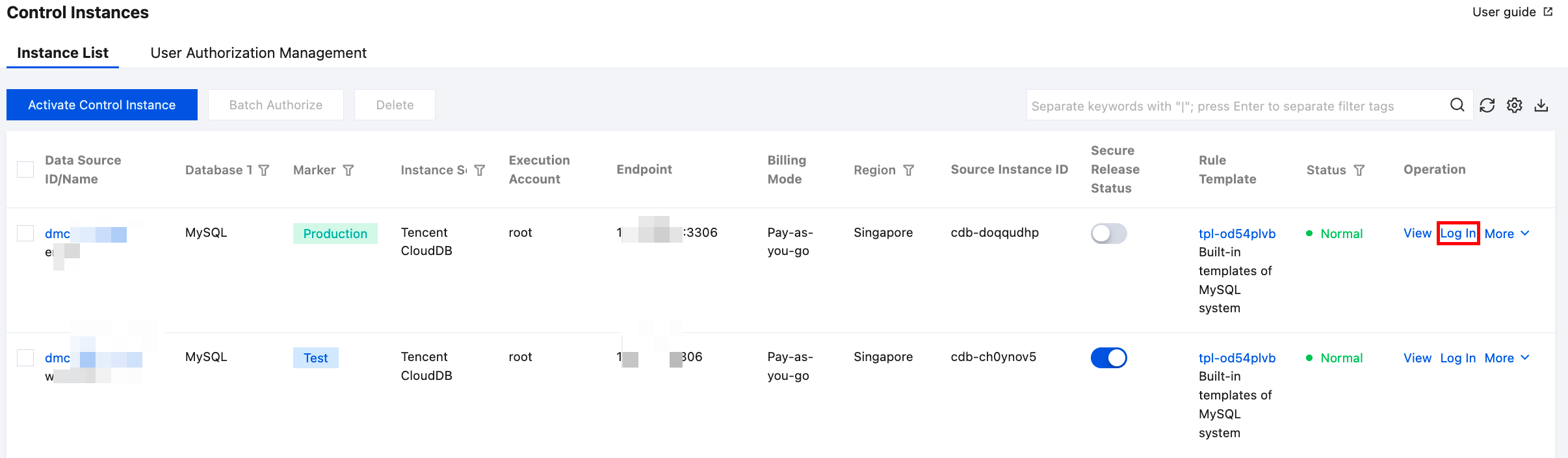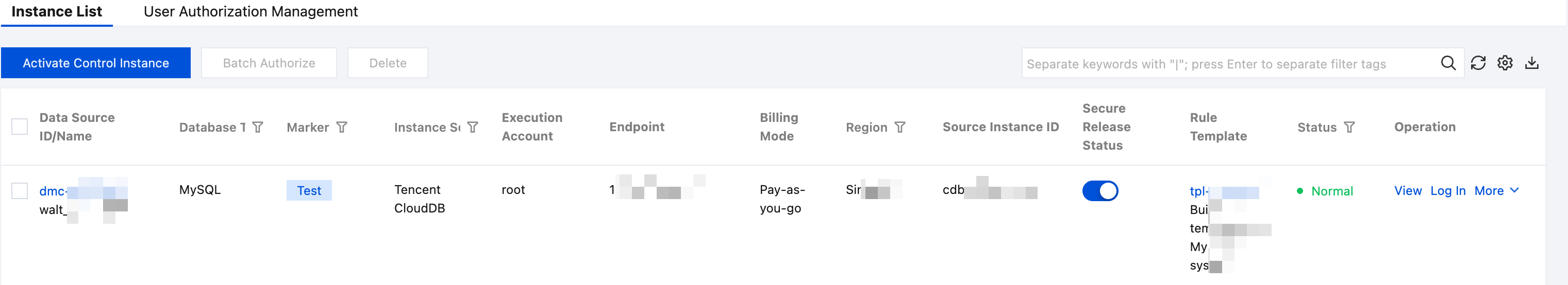 Operation | Secure Release Login SQL Window: Click Log In to go to the SQL window page. Apply for Database and Table Operation Permissions: Click More > Grant Permissions. For details, see Permission Application. Delete Controlled Instance: Click More > Delete, and then click OK. After deletion, the data source will no longer appear on the control instance page. It will still be displayed on the data source page, but will have control disabled. Control can be re-enabled later as needed. |