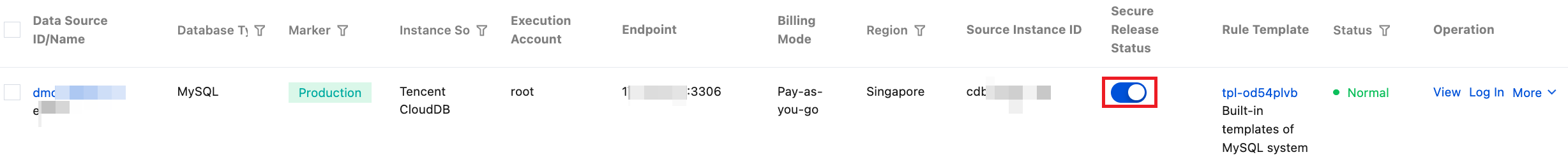 You can also click View or Data Source ID in the Operation column to access the instance details page and click the secure release status switch.