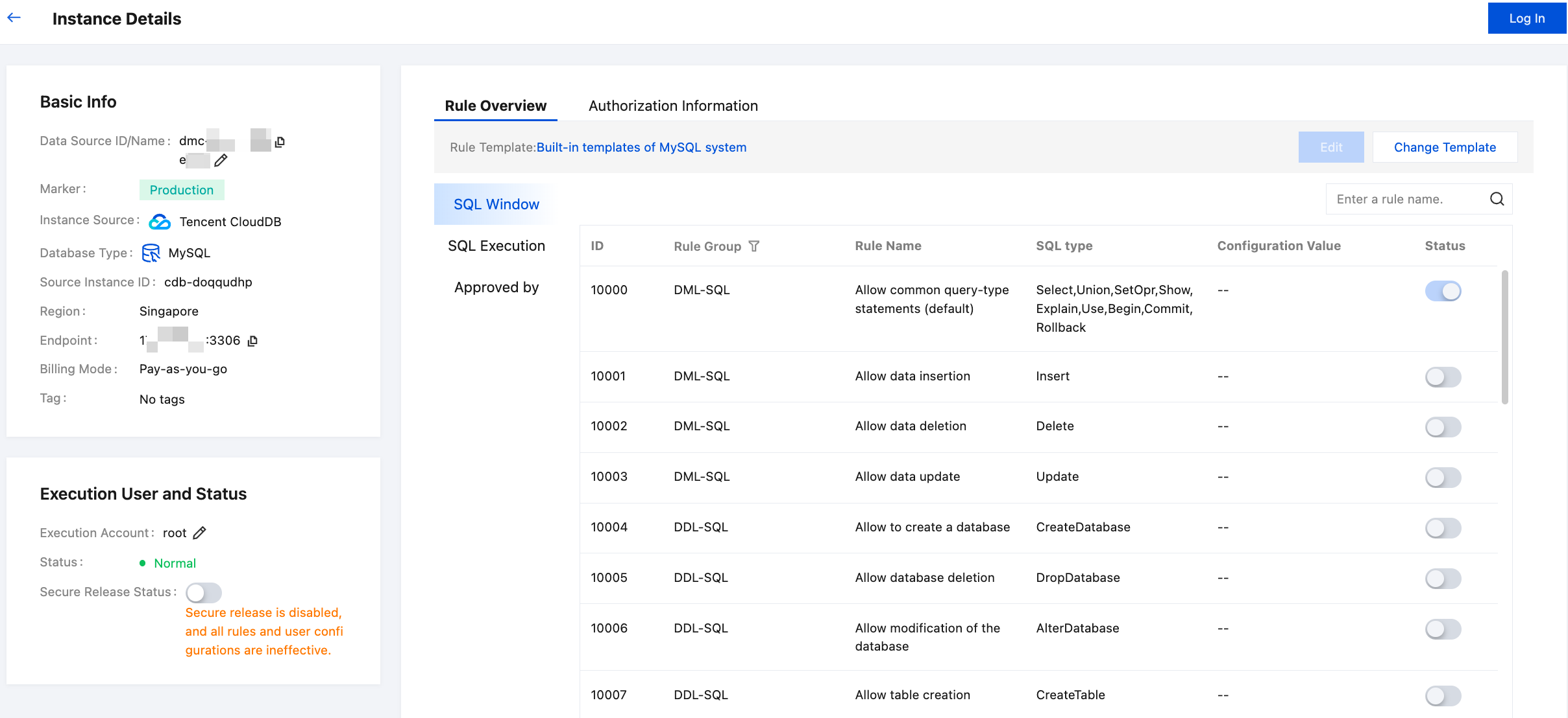 Control Instances also supports one-click login, viewing instance details, modifying execution accounts, granting or revoking user operation permissions, changing instance rule templates, enabling or disabling the secure release status, and exporting the controlled instance list.