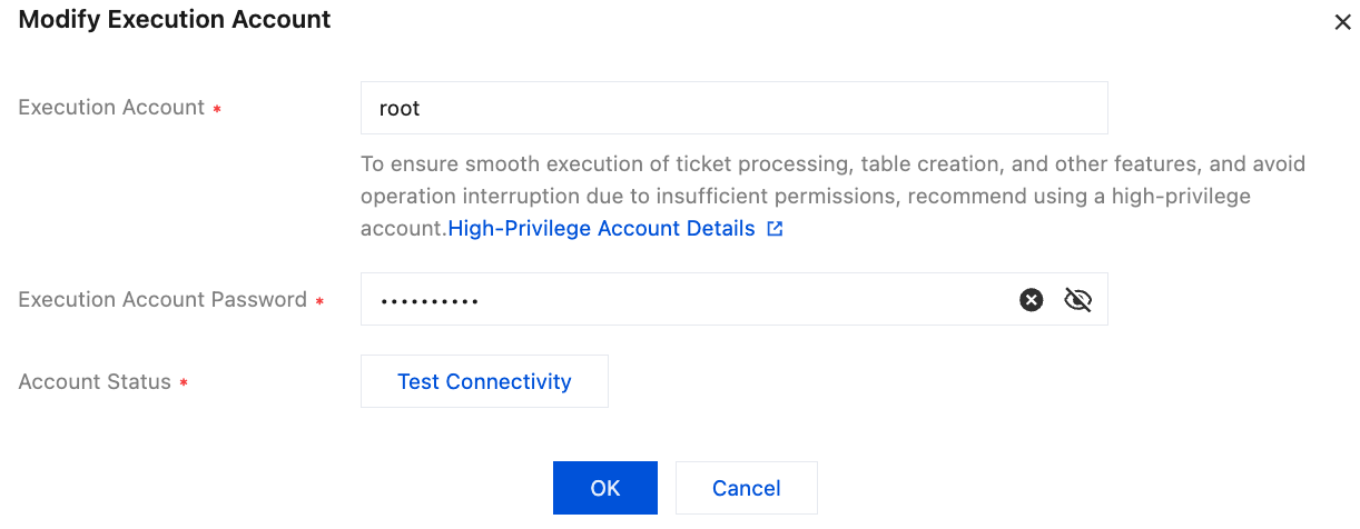 5. In the pop-up dialog box, modify the execution account and the execution account password, click Test Connectivity, and after the test passes, click OK.