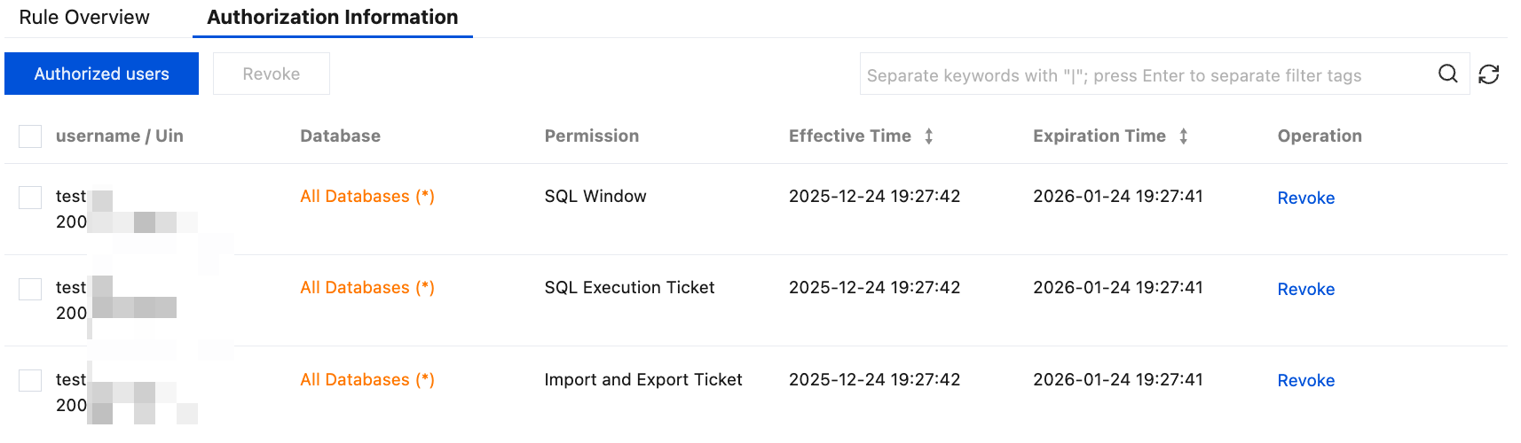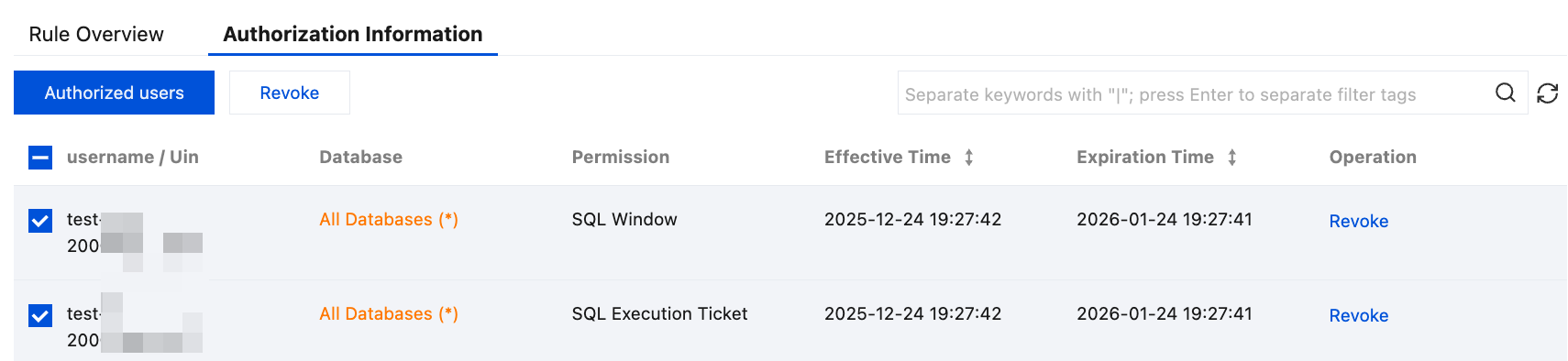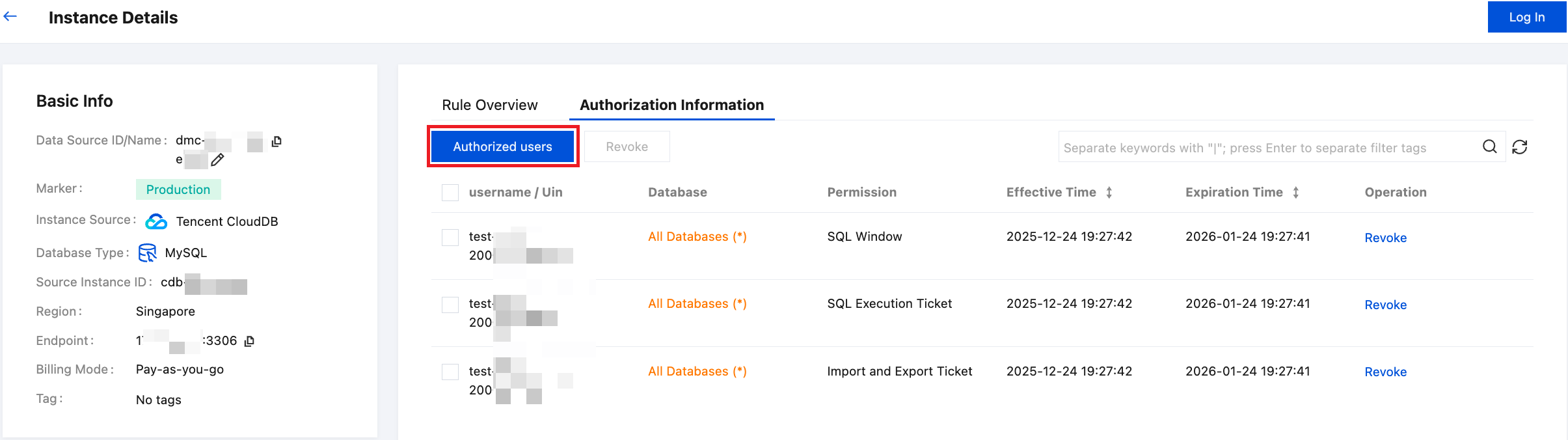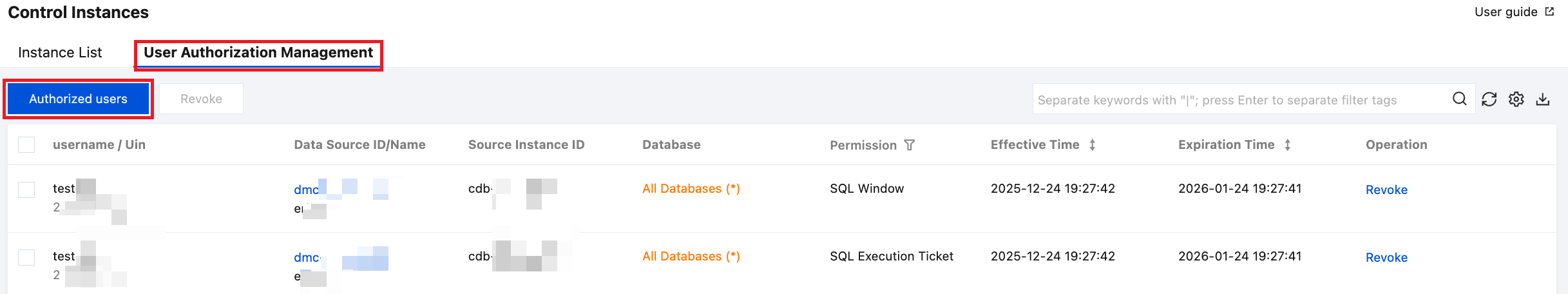 Method 3: Select the Instance List tab, click View or Data Source ID in the Operation column corresponding to the managed instance, select the Authorization Information tab, and click Authorized users.
