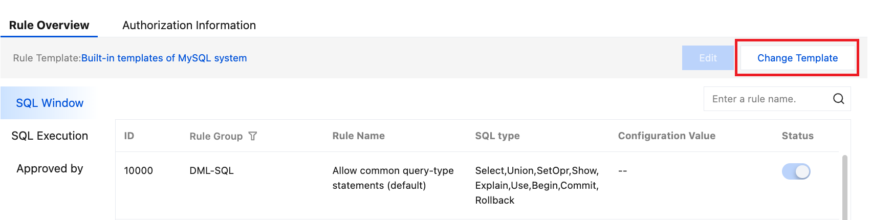 Check the bound rule template and its configurations, including SQL window, SQL change rules, and approvers.