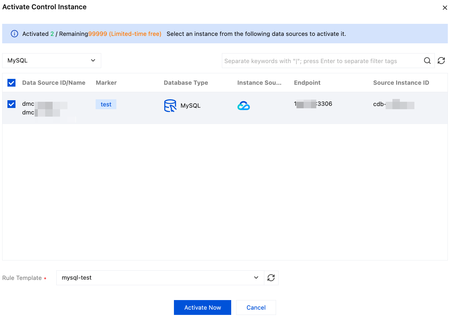 4. In the pop-up dialog box, select the database type, choose an existing data source, select a rule template, and click Activate Now.