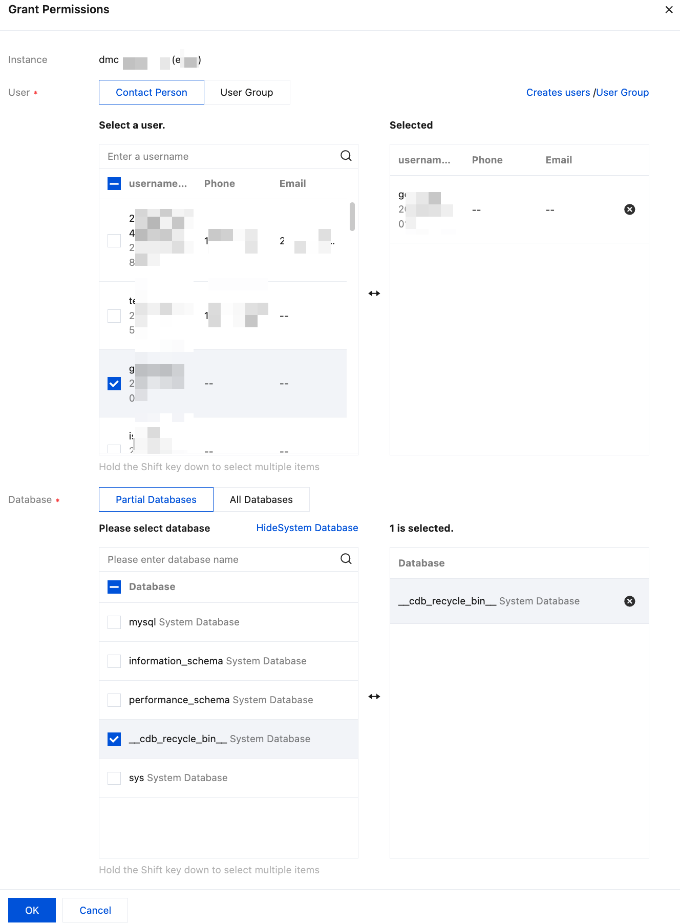 4. In the right panel, select the instance, user, database, permissions, and validity period, and click OK.
