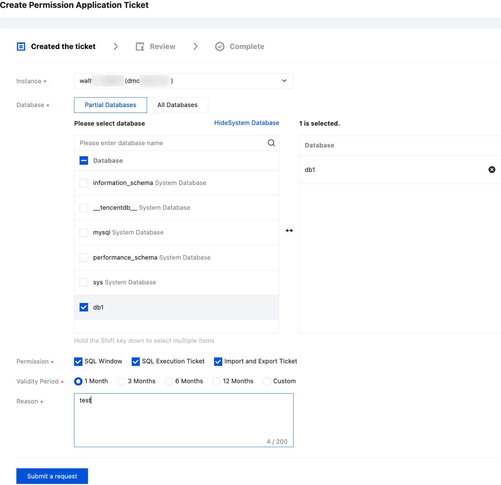 3. On the Create Permission Application Ticket page, select execution instance (displays data source name and ID), database, permissions, and validity period, and then click Submit a request.