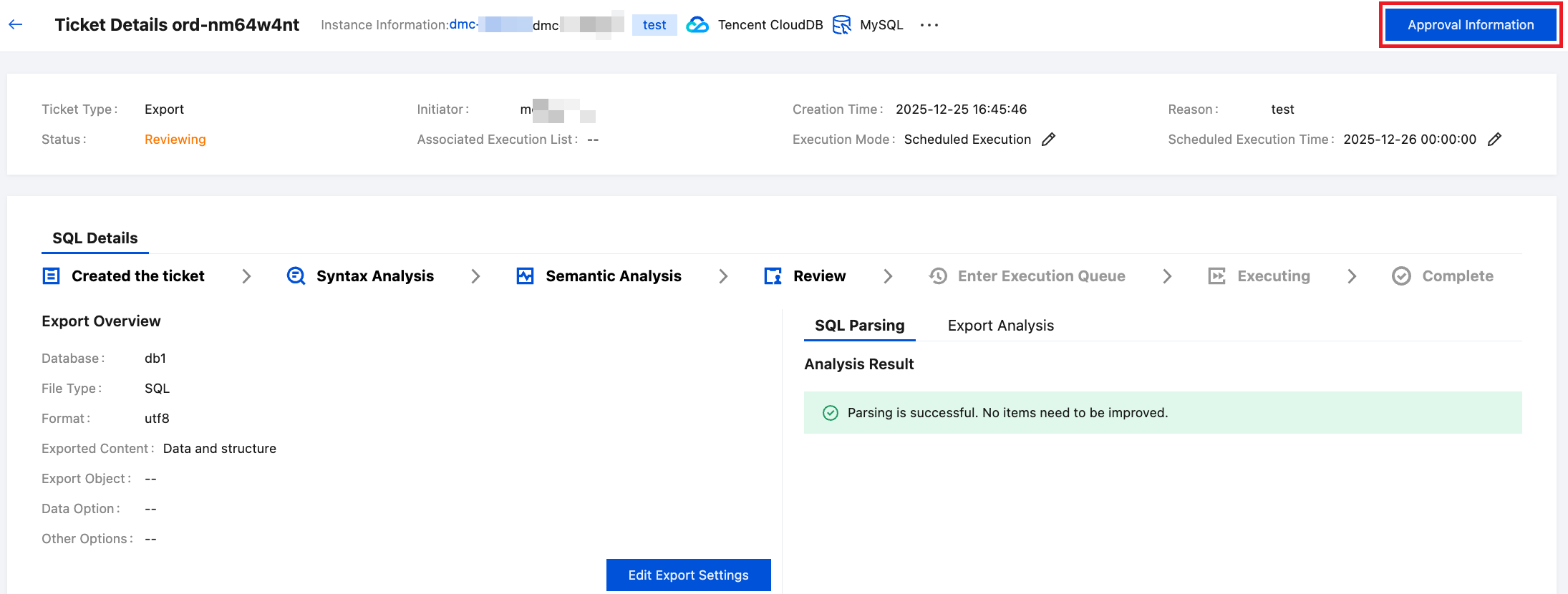 5. On the ticket details page, view the ticket details or SQL check results. If everything is correct, click Approval Information in the upper-right corner.