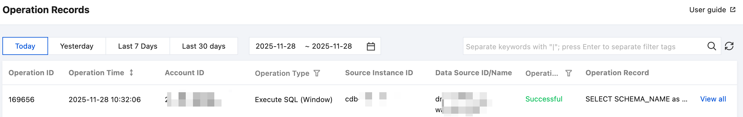 When the operation type is Execute SQL (Window), you can click View all in the row where the operation history is located to view the complete SQL statement.