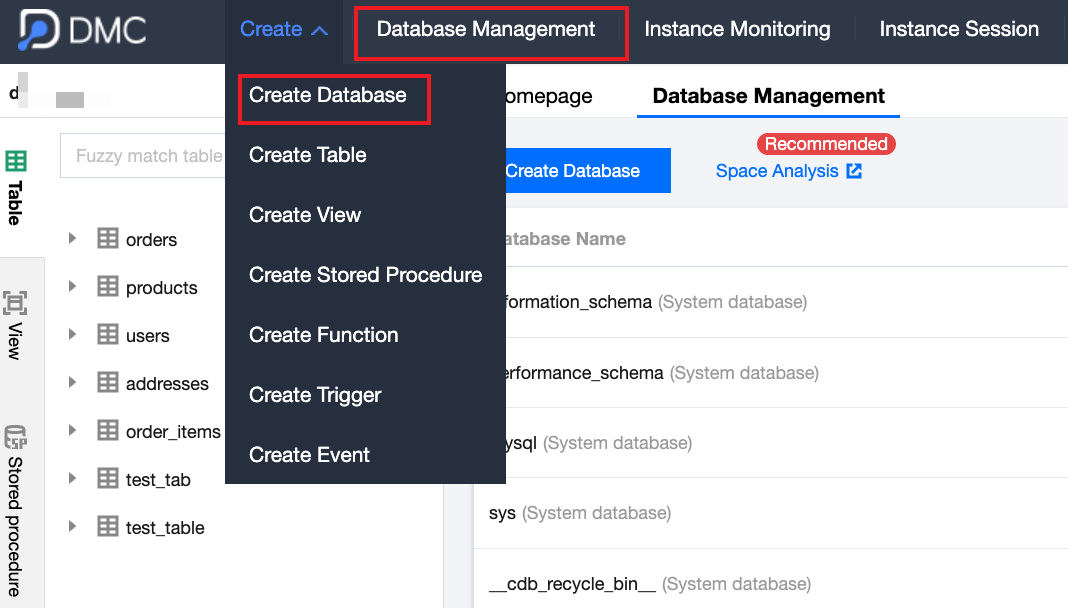 1. In the top menu bar, select Create > Create Database or click Database Management.