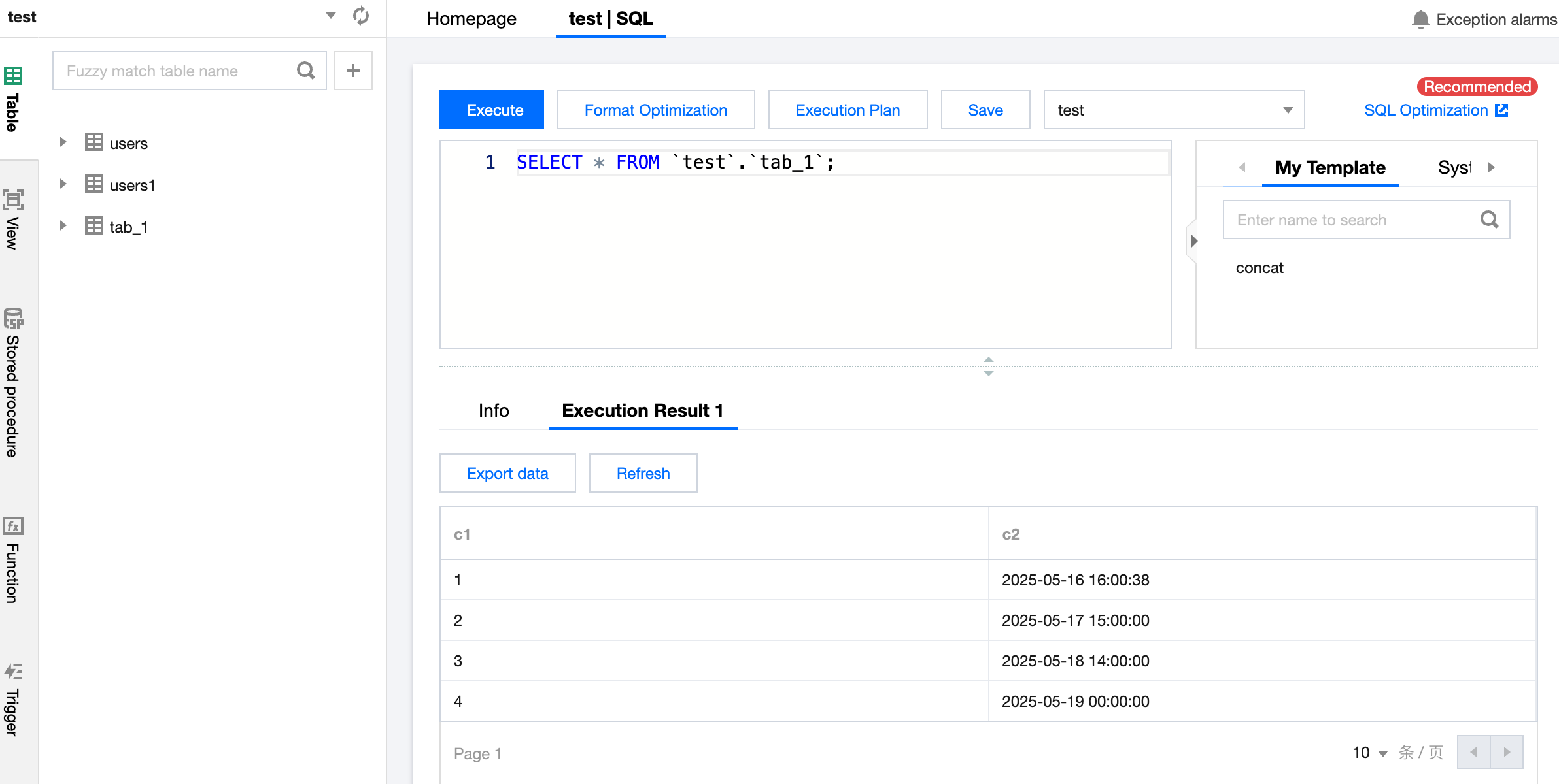 The SQL window provides users with an SQL editor, supporting common SQL templates and the ability to save custom SQL. It also supports displaying and exporting SQL results.
