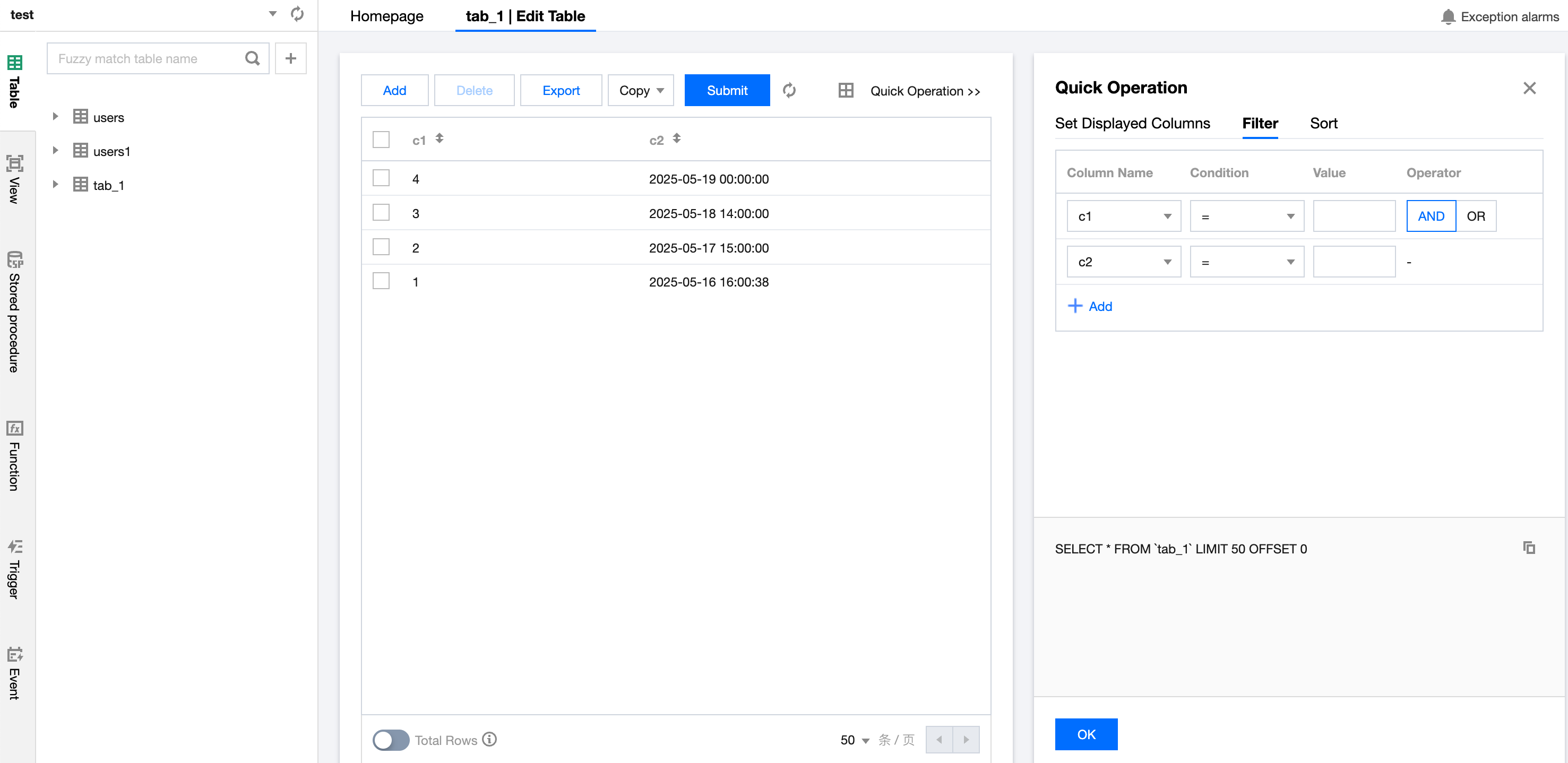 In the left sidebar, select the database and table, click the table name, and edit the table data. Once the modifications are complete, click Submit. In the pop-up dialog box, click Execution. In the Quick Operation on the right, you can filter and sort fields as needed.
