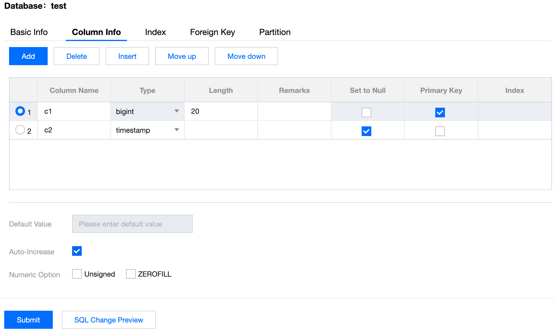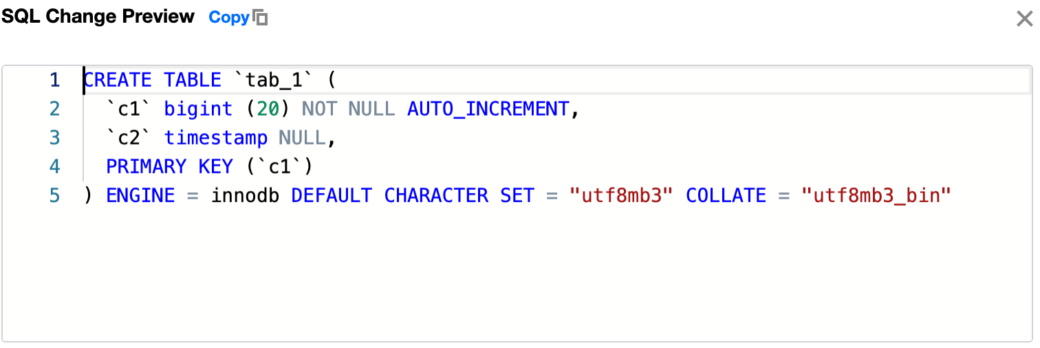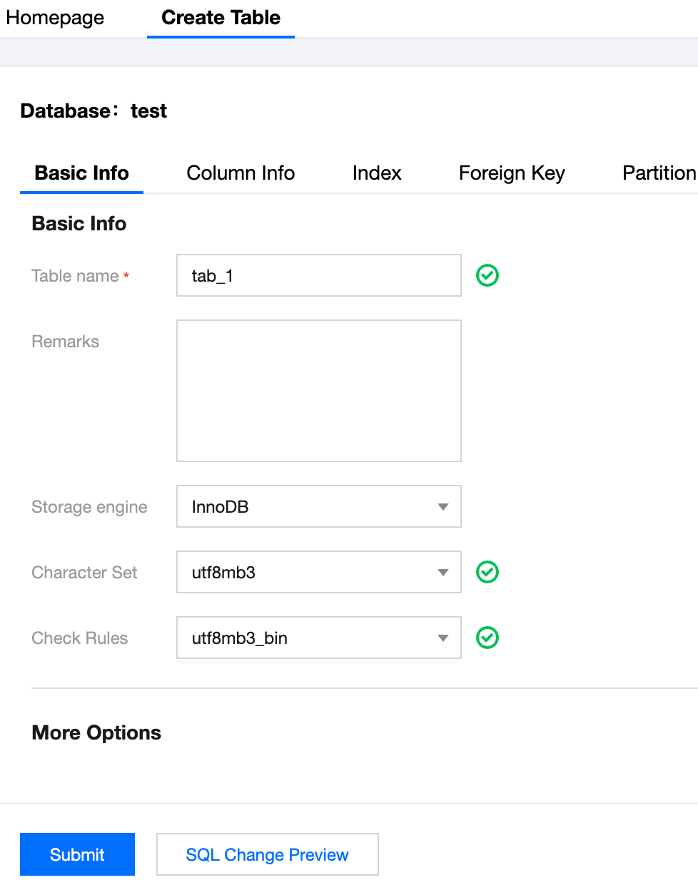 2. In the top menu bar, select Create > Create Table or click on the left side. 3. On the create table page, configure the basic table settings, including columns, indexes, foreign keys, and partition information, as prompted by the page. After you complete the configuration, click Submit, and then click OK in the pop-up dialog box.