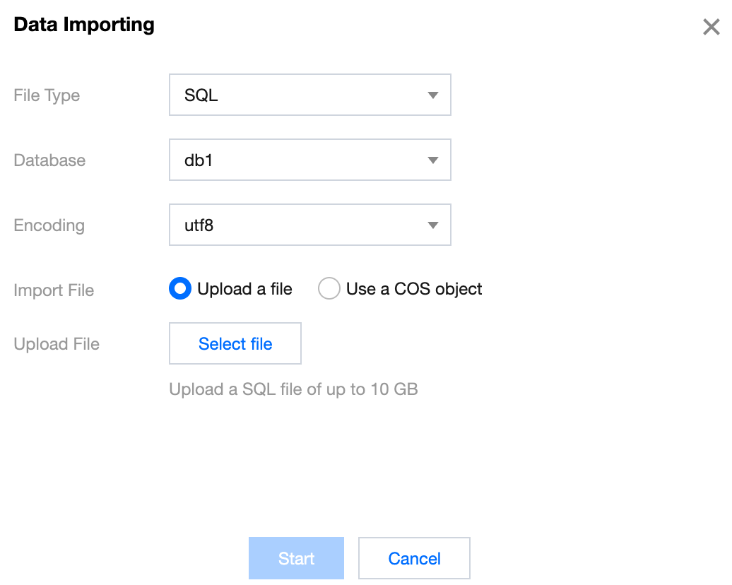 Log in to the DMC Console, switch to the top feature tab, select Import/Export and Data Importing, configure the import parameters, and click Start. File type: Supports SQL and CSV.