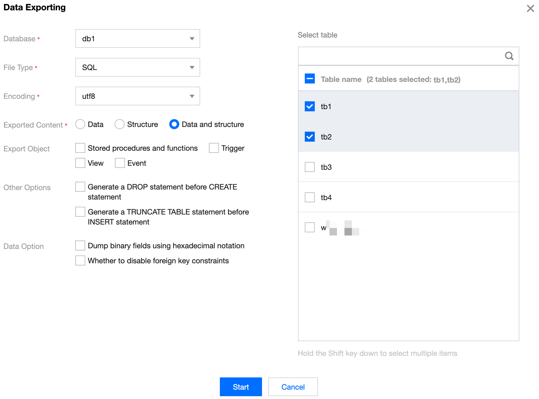 Log in to the DMC Console, switch to the top feature tab, select Import/Export and Data Exporting. Configure the export parameters, check the databases and tables to be exported on the right, and click Start.