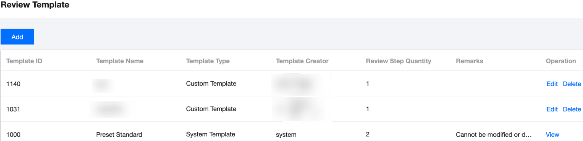 Delete approval template: When an added approval template is no longer needed, click Delete in the operation column corresponding to the template. In the pop-up dialog box, click OK.