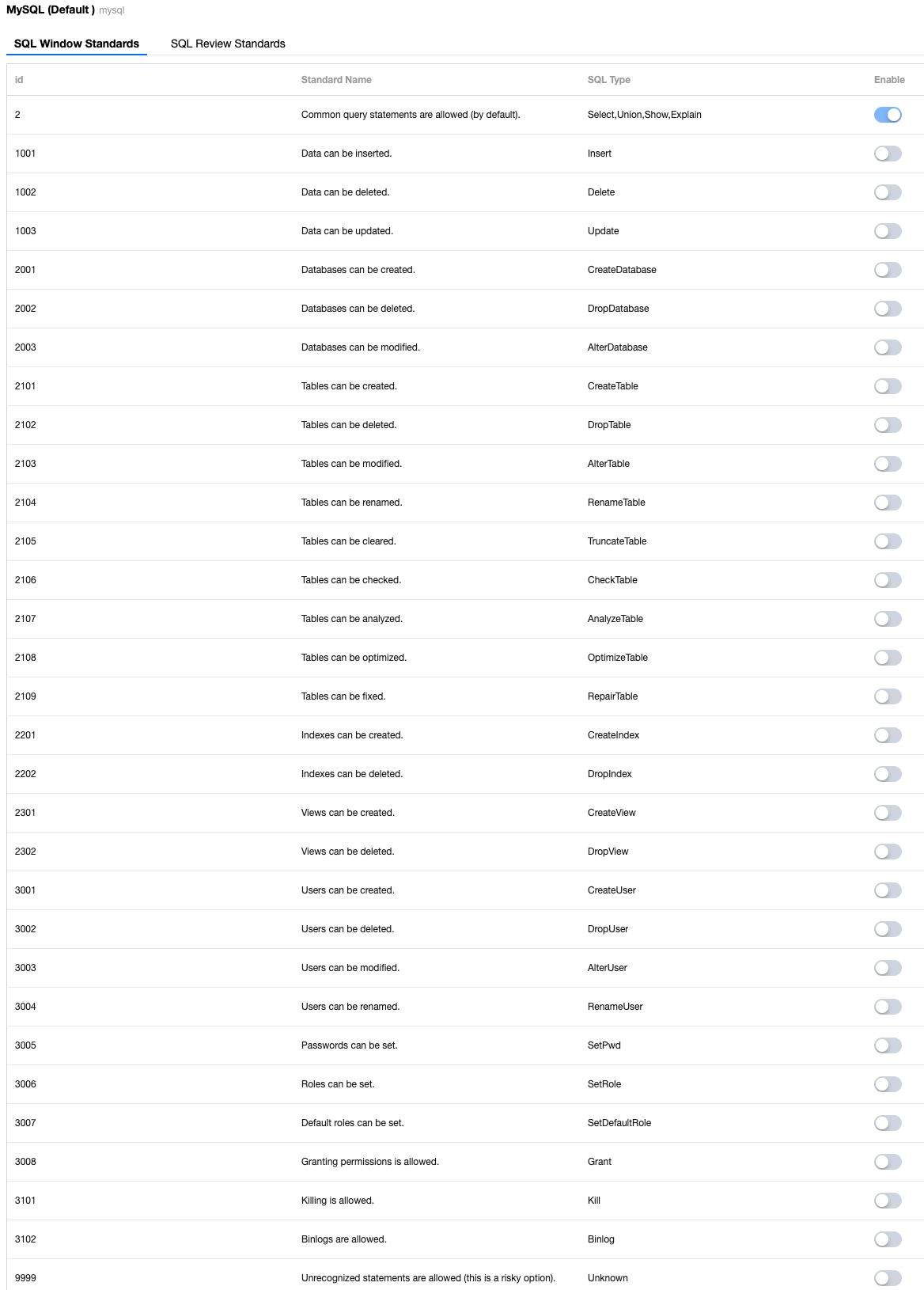 4. On the Management Standard Details page, select the SQL Window Standards and SQL Review Standards tabs to view and enable specific specifications.