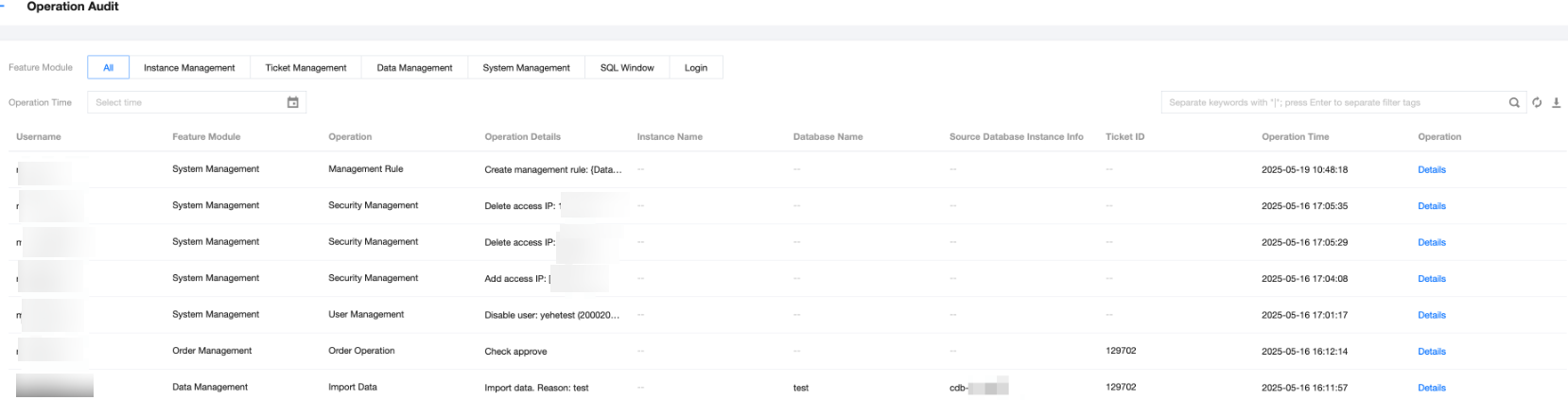 DMC supports auditing operations across various modules, including instance management, ticket management, data management, system management, SQL window, and login module. It also enables users to view operation details and download CloudAudit records, facilitating quick identification of database issues and audits.
