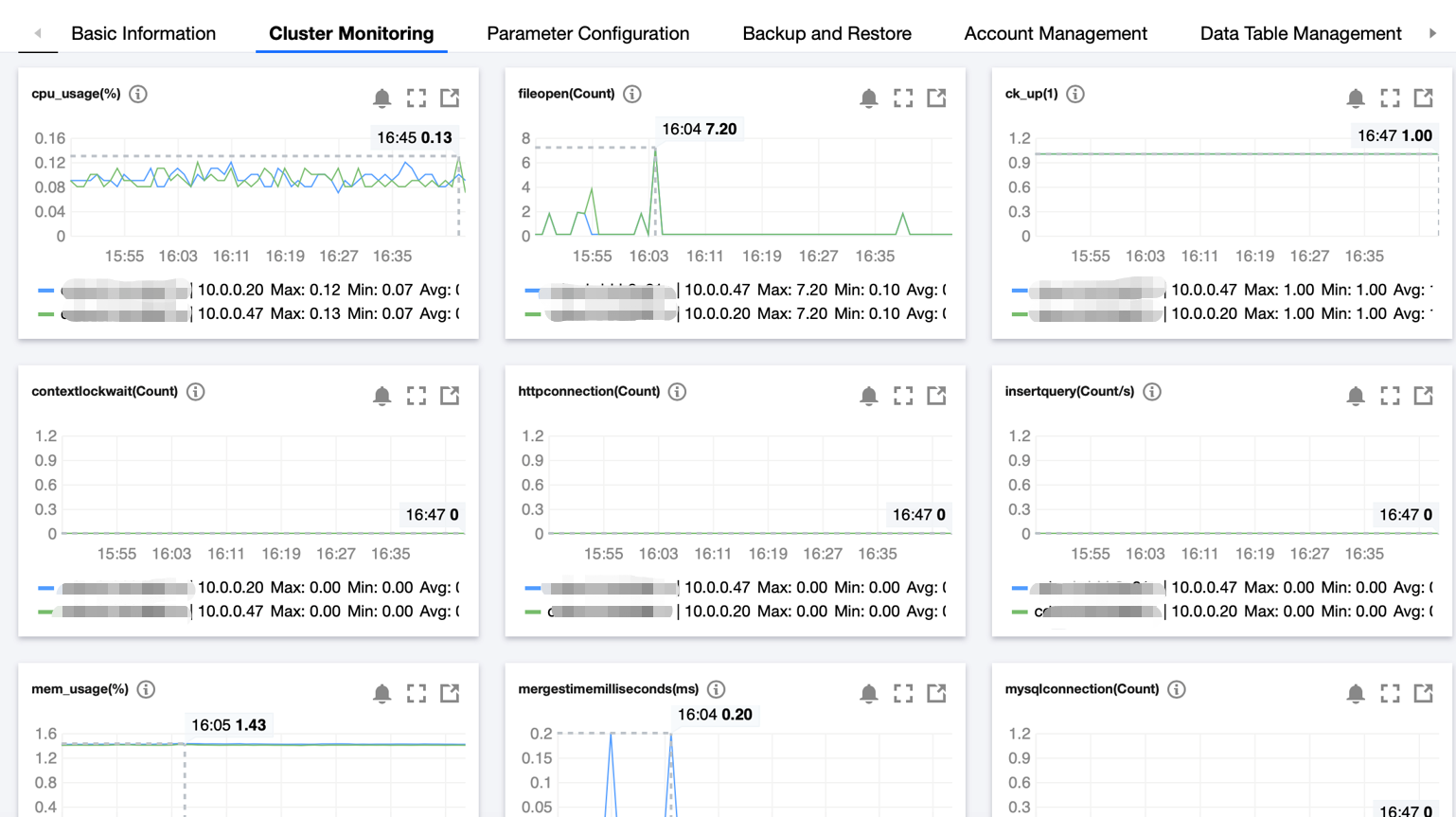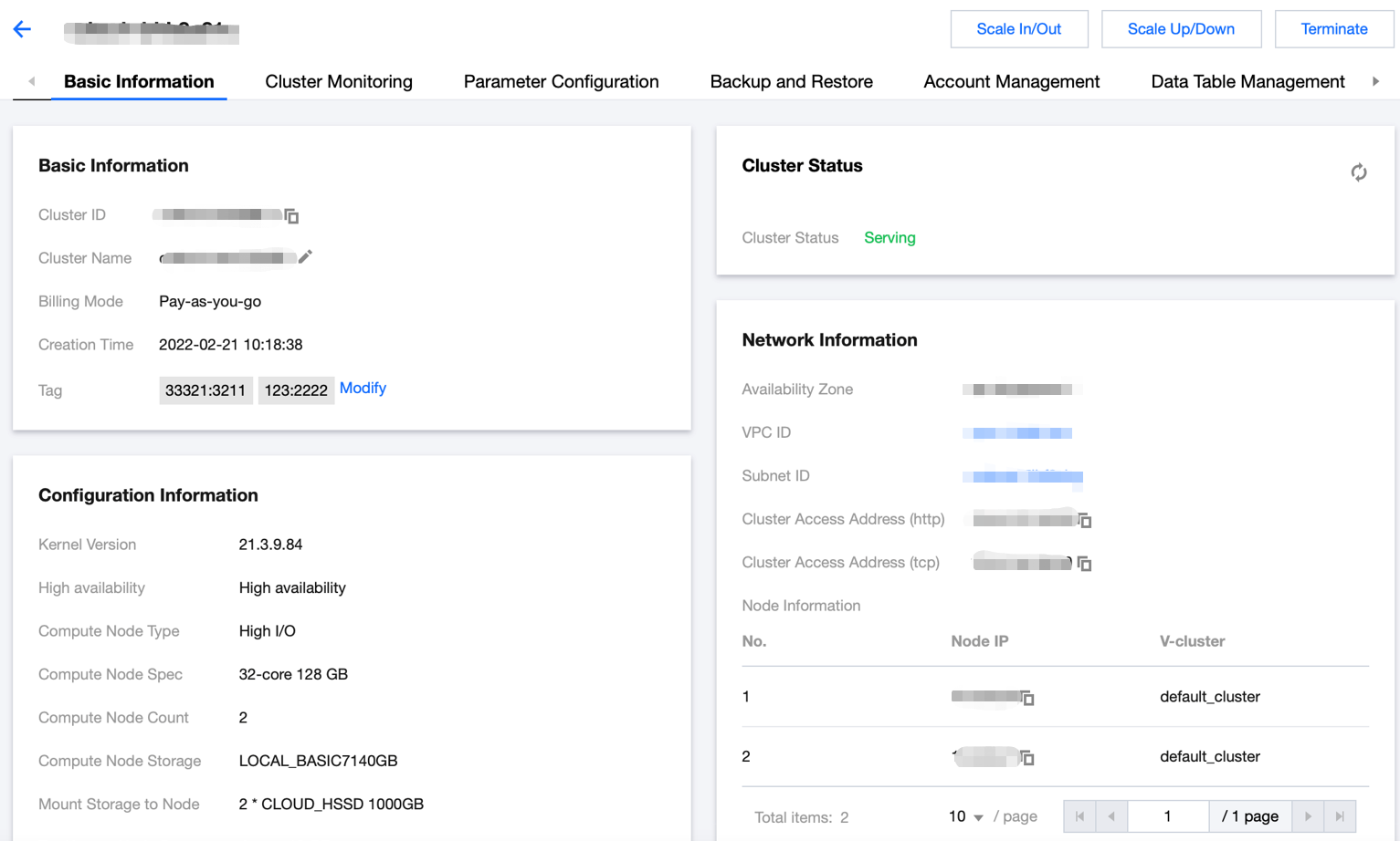 After the cluster is created, go to the Tencent Cloud TCHouse-C console and click the Cluster ID/Name on the cluster list page to enter the cluster details page. On the cluster details page, view basic cluster information, monitoring information, and operation log, and configure parameters.