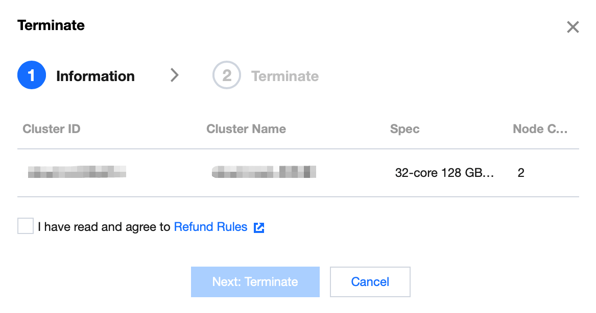 Select Operation > Terminate in the cluster list to terminate a cluster as prompted.