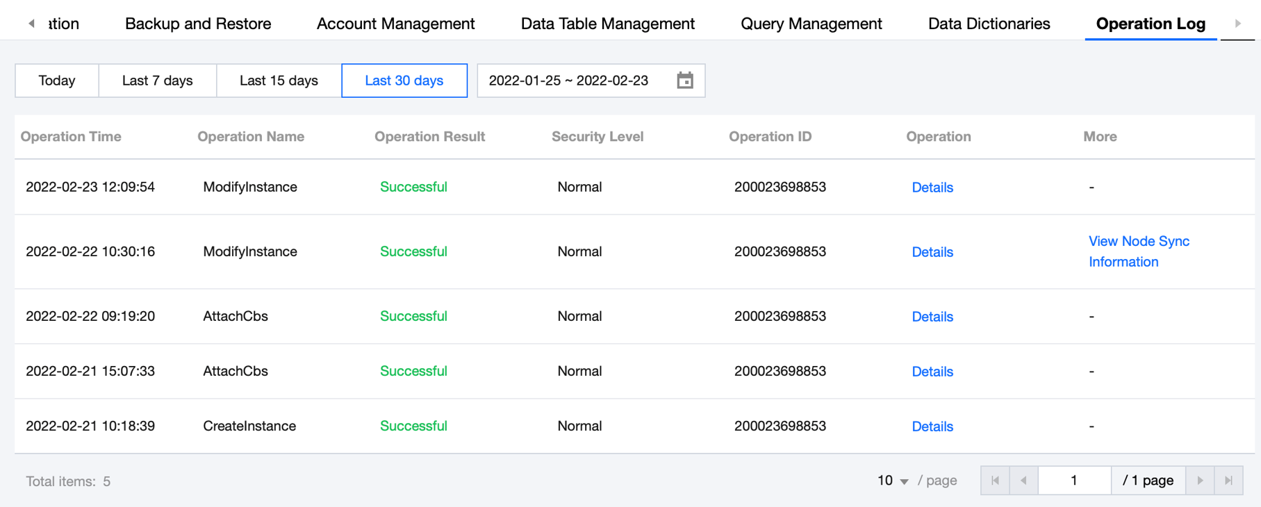 On the cluster details page, select the Operation Log tab to view all operations over a specified period of time.