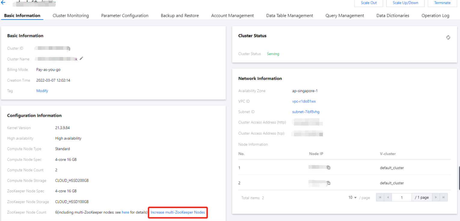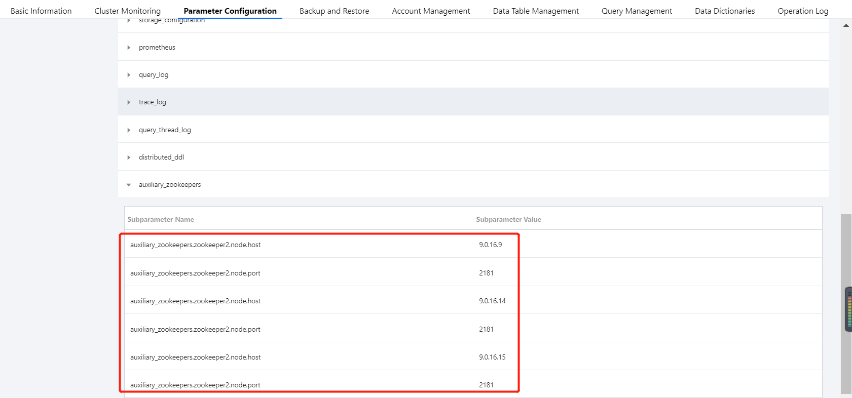 --创建表时,如果是使用第二套zookeeper就在创建表的zookeeper路径前加:'zookeeper2:'前缀,以此类推,使用第三套zookeeper,则加'zookeeper3'前缀。CREATE TABLE testdb.account2 ON CLUSTER default_cluster(accountid UInt16,name String,address String,year UInt64) ENGINE =ReplicatedMergeTree('zookeeper2:/clickhouse/tables/{layer}-{shard}/testdb/account2', '{replica}') ORDER BY (accountid);